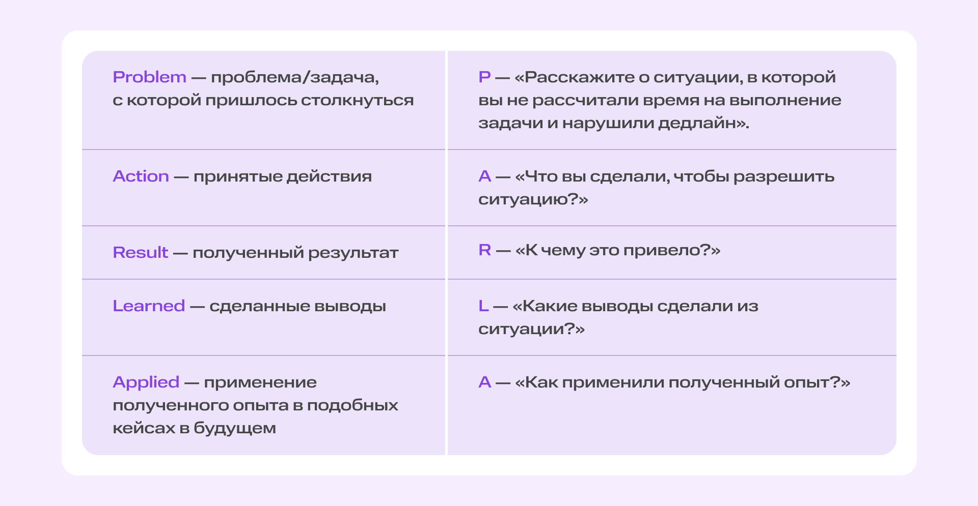 Есть еще одна схожая методика — PARLA. Она поможет понять, как кандидат справляется со сложностями. Приведем примеры вопросов.