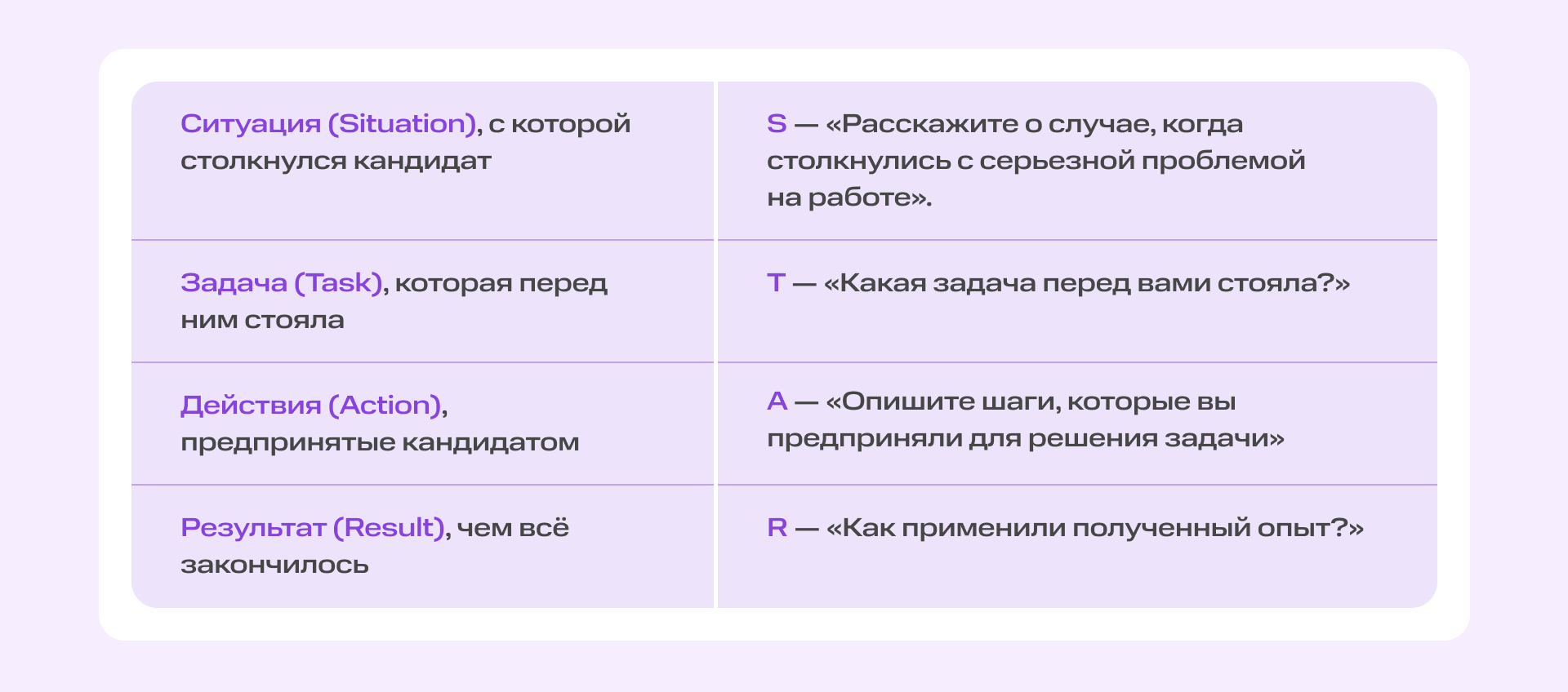 Например, методику STAR — популярный метод на базе ситуационных и поведенческих вопросов.