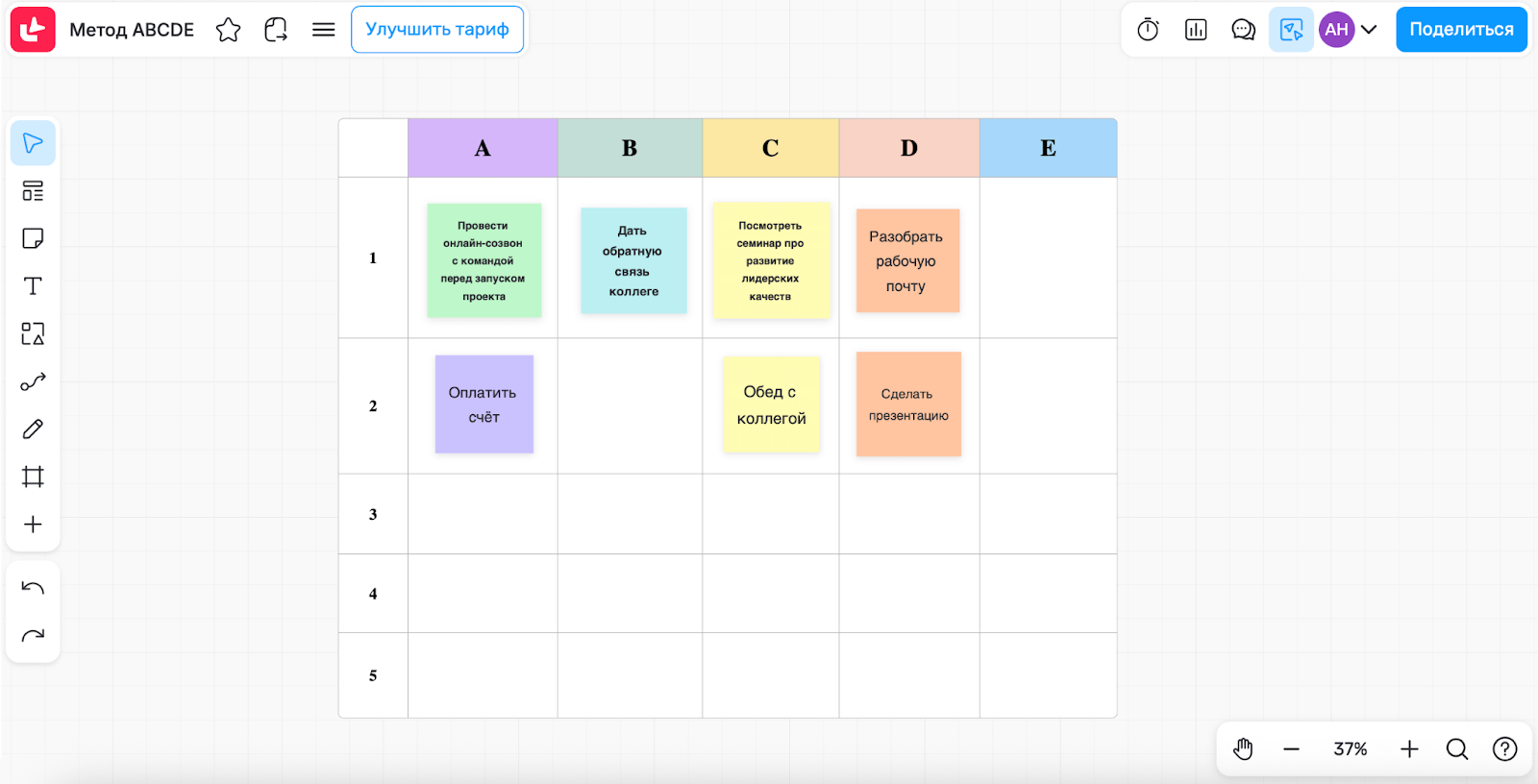 Регулярно обновляйте статусы и приоритеты задач, передвигая карточки между столбцами. Неактуальные смело помещайте в колонку E.