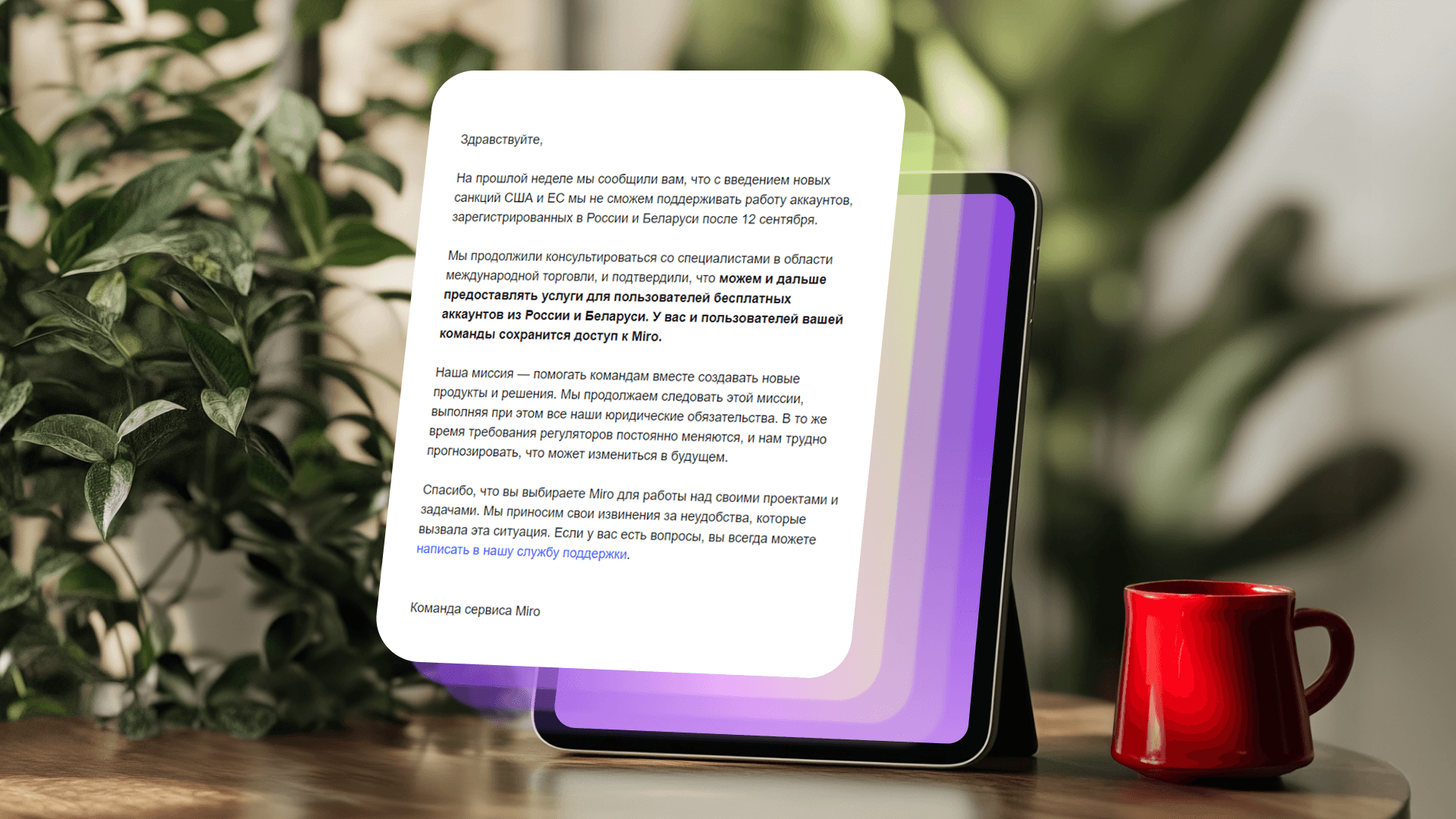 Эпопея с Miro началась еще в марте 2022 года, когда компания объявила о закрытии филиала в Перми и прекратила новые продажи в России и Беларуси. Часть пермской команды была переведена в европейские страны. В декабре 2022 года было ликвидировано российское юрлицо Miro ООО «Мультивитамин». Тем не менее сервис продолжал работать в РФ: можно было в прежнем режиме поработать на доске, но только на бесплатном тарифе с ограничениями.