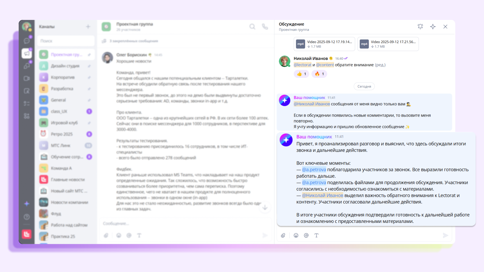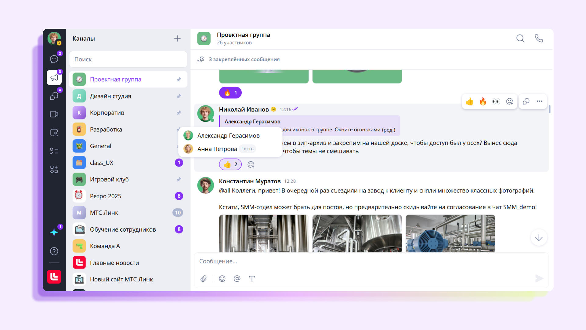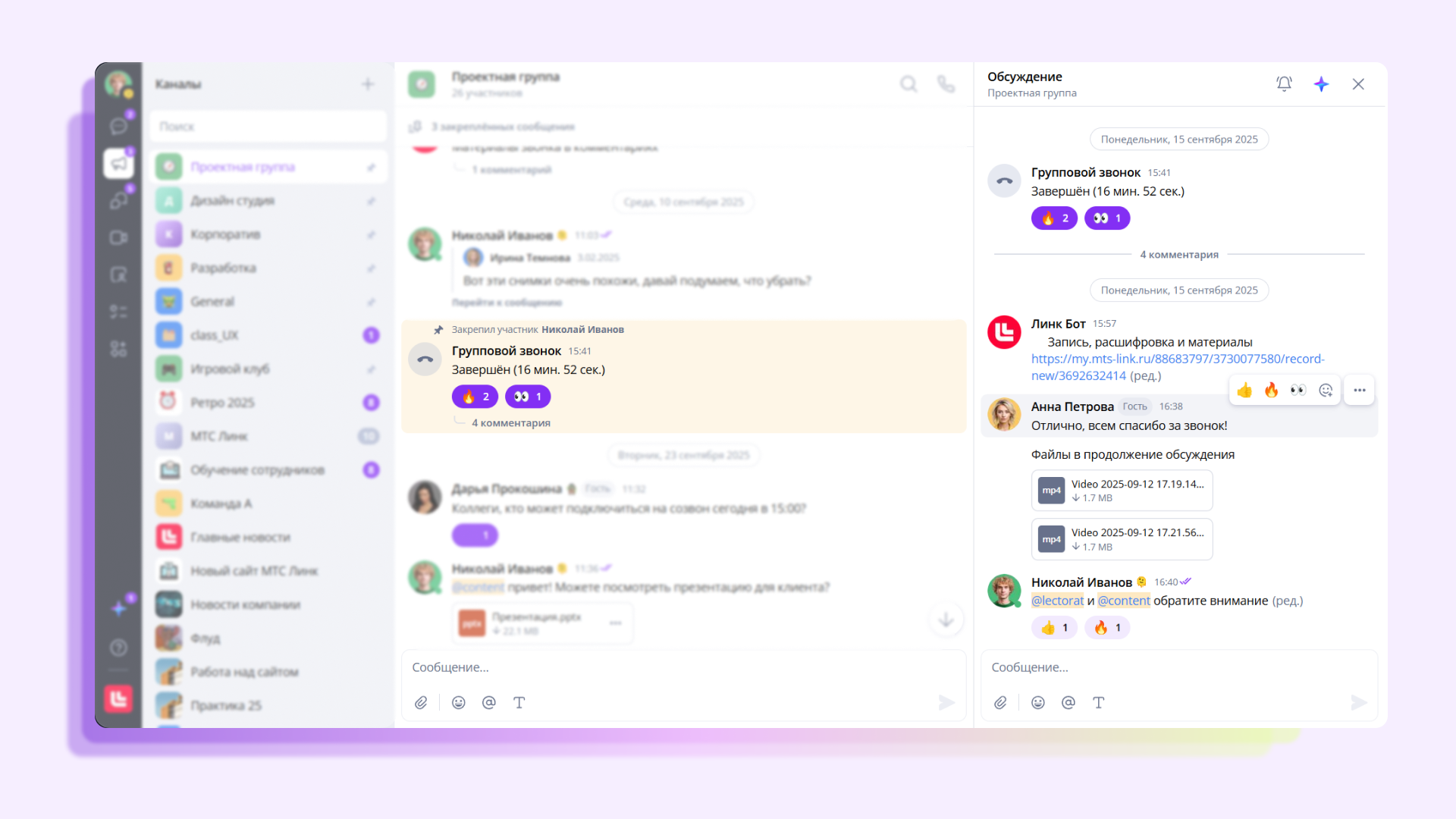 При создании корпоративного мессенджера мы фокусировались на решении, которое будет помогать пользователям эффективно работать и взаимодействовать друг с другом. В 2026 году планируем выпустить ряд улучшений, которые сделают этот опыт ещё лучше, например: