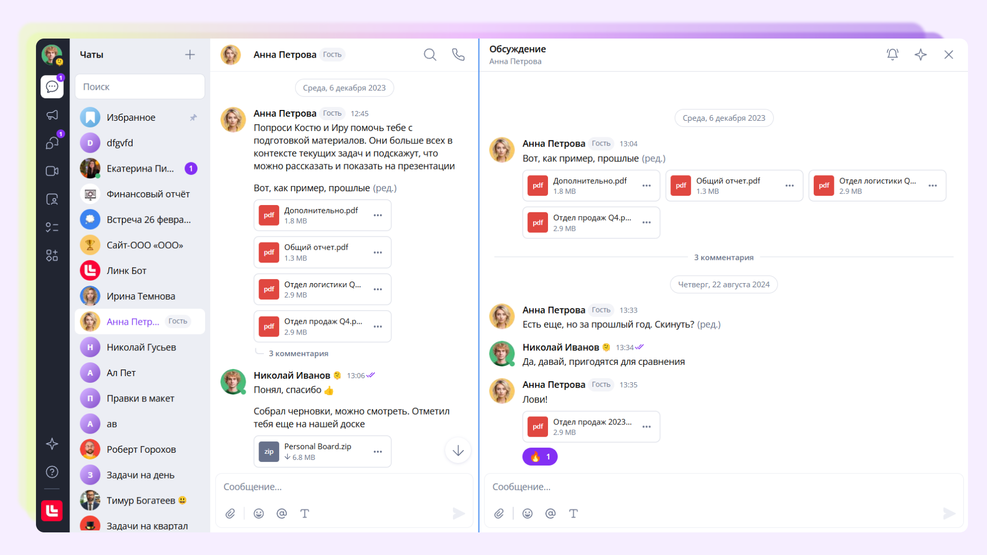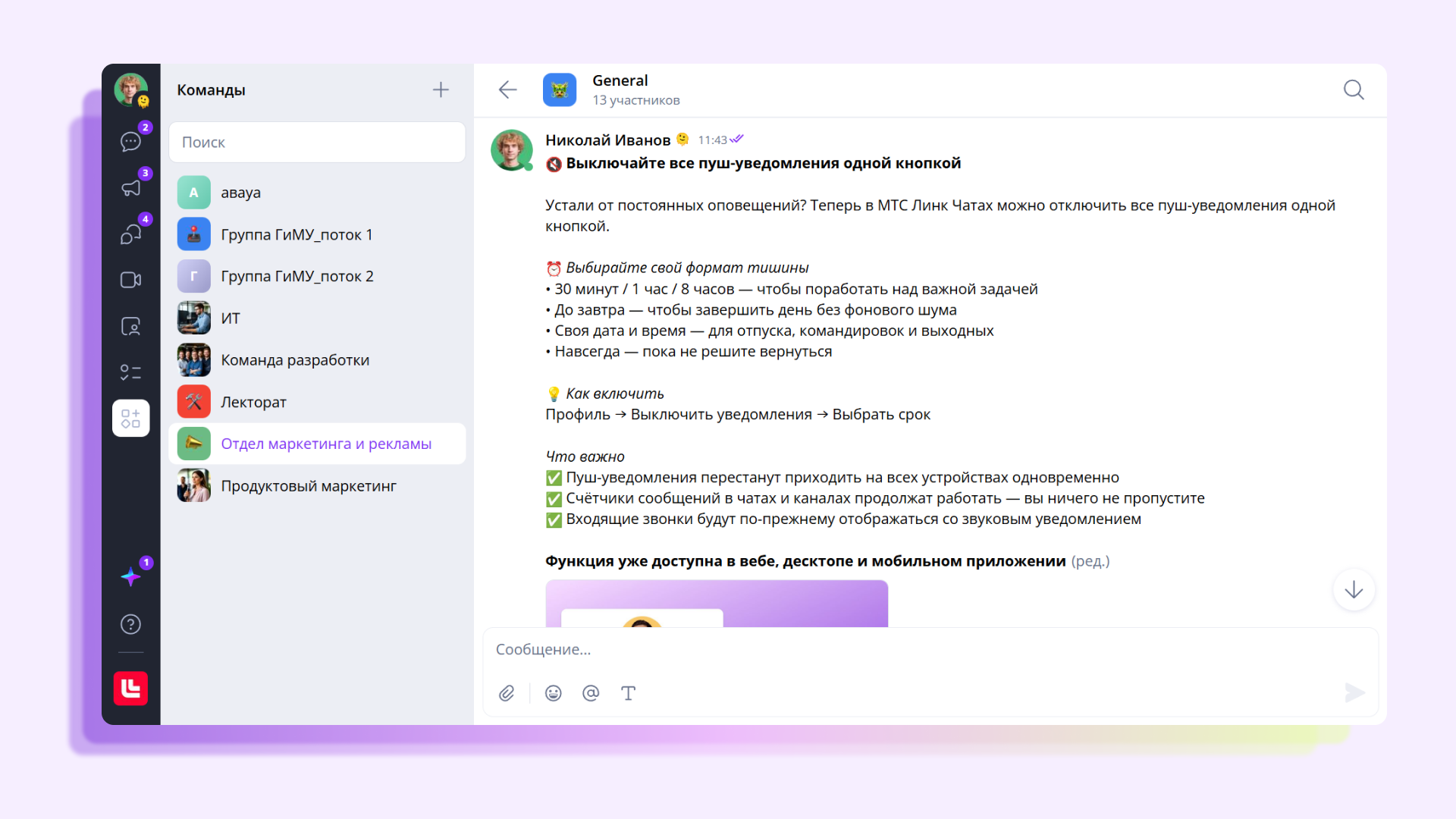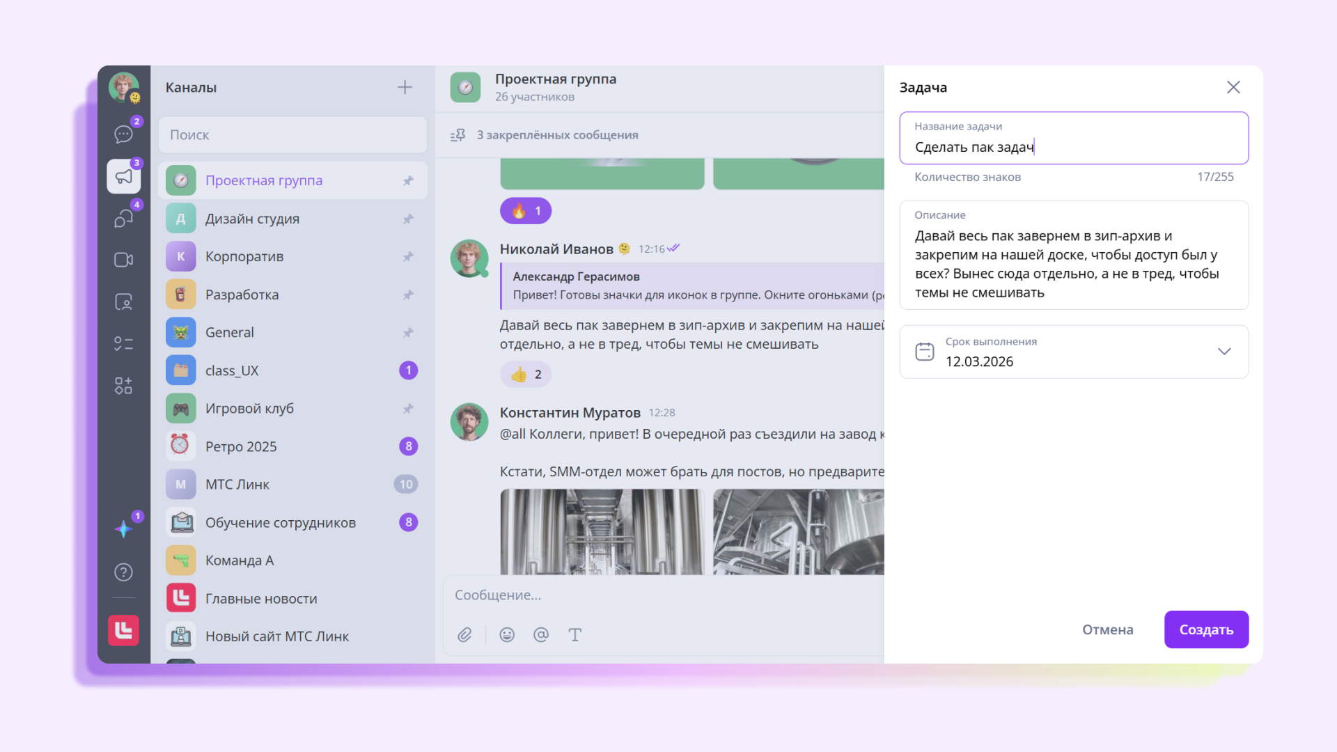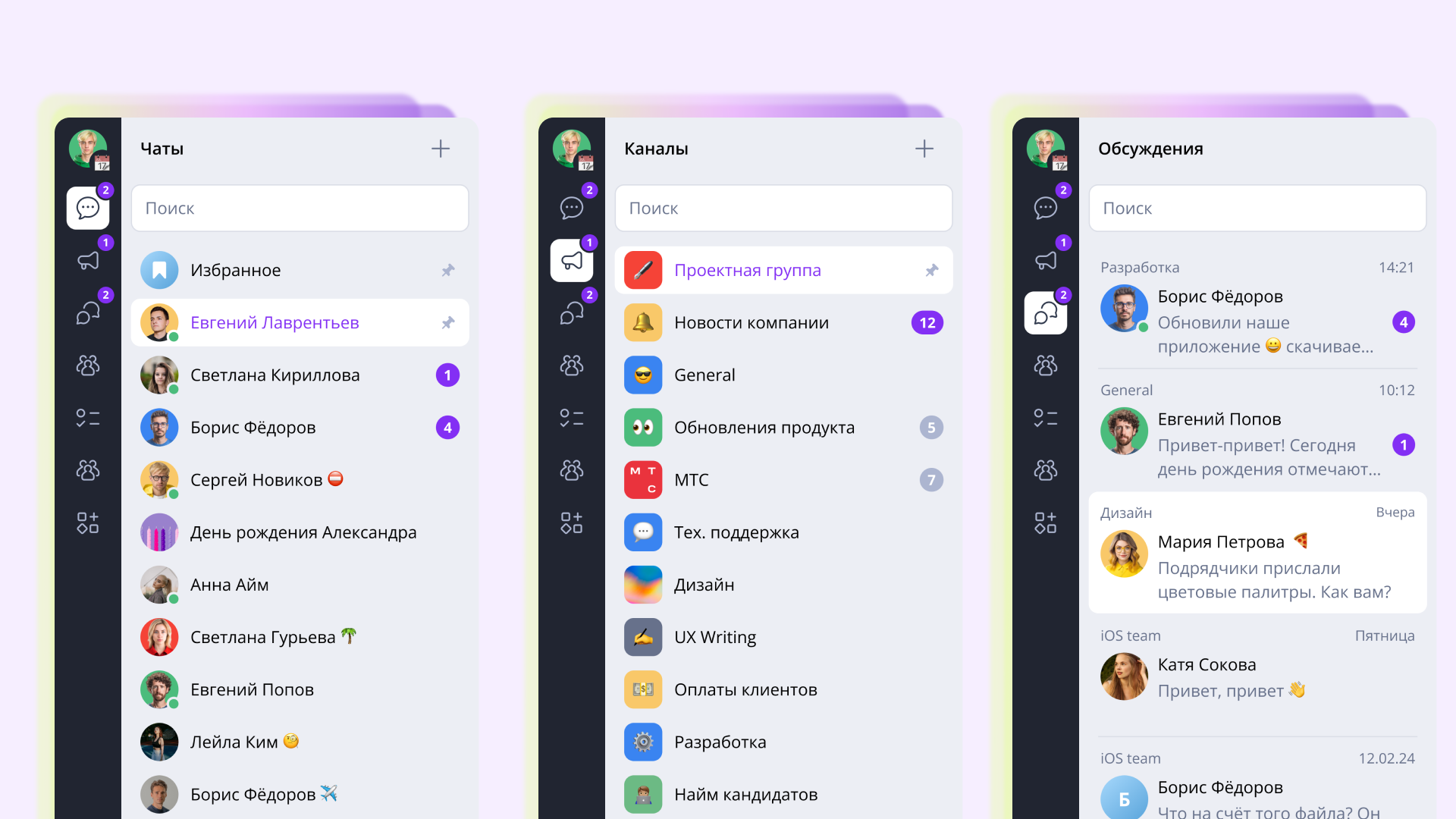 При создании корпоративного мессенджера мы фокусировались на решении, которое будет помогать пользователям эффективно работать и взаимодействовать друг с другом. В 2026 году планируем выпустить ряд улучшений, которые сделают этот опыт ещё лучше, например: