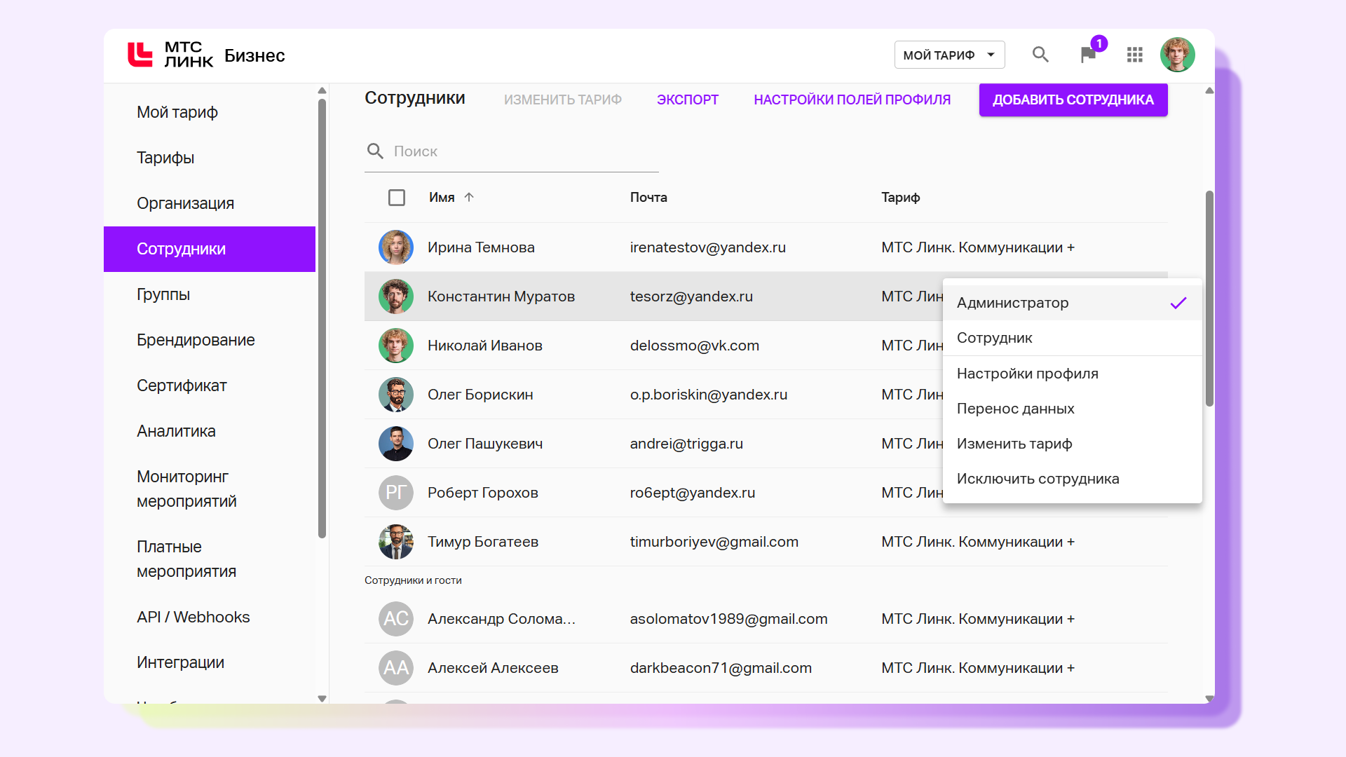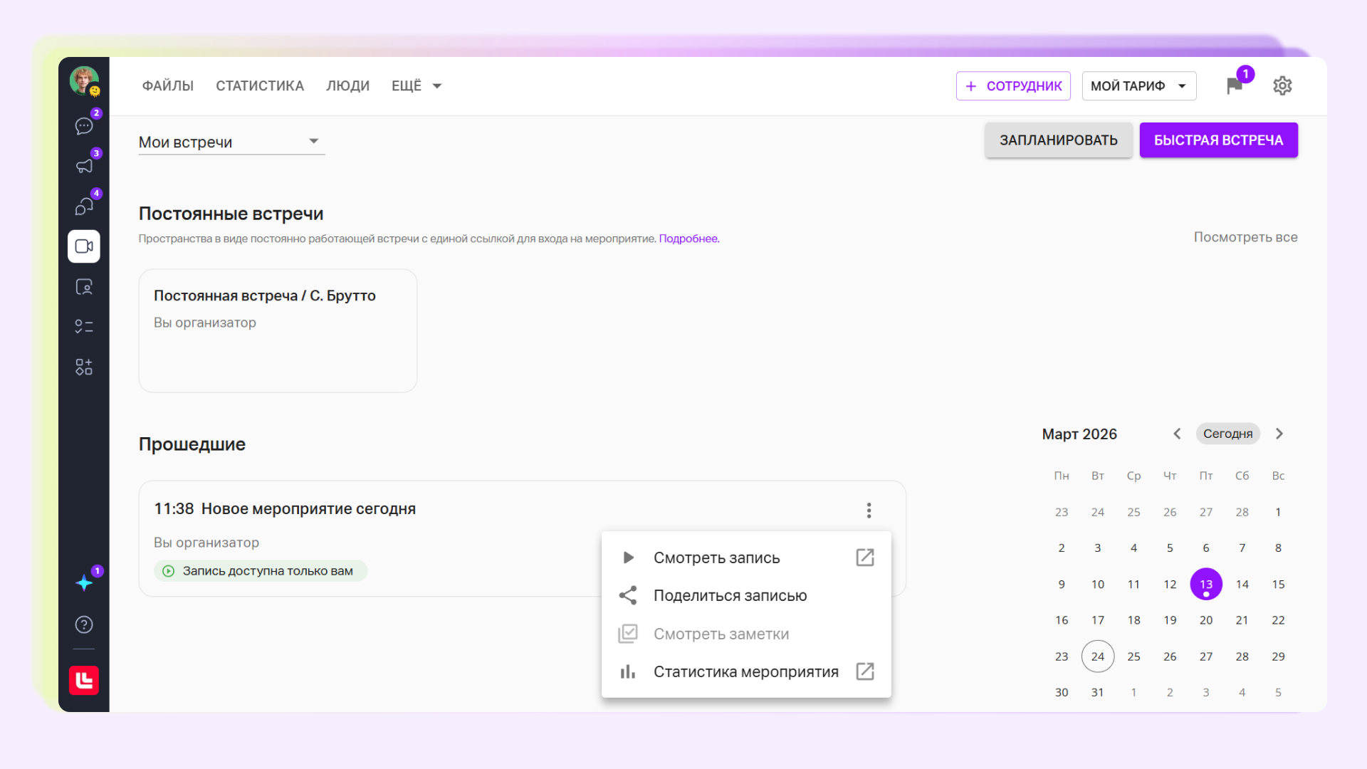 Раздел «Встречи» — это место для планирования мероприятий на будущее, куда можно пригласить людей по почте или из списка участников в корпоративном мессенджере. Благодаря интеграции с календарями Microsoft, Google и «Яндекс» запланированные встречи появятся в рабочем календаре участников.