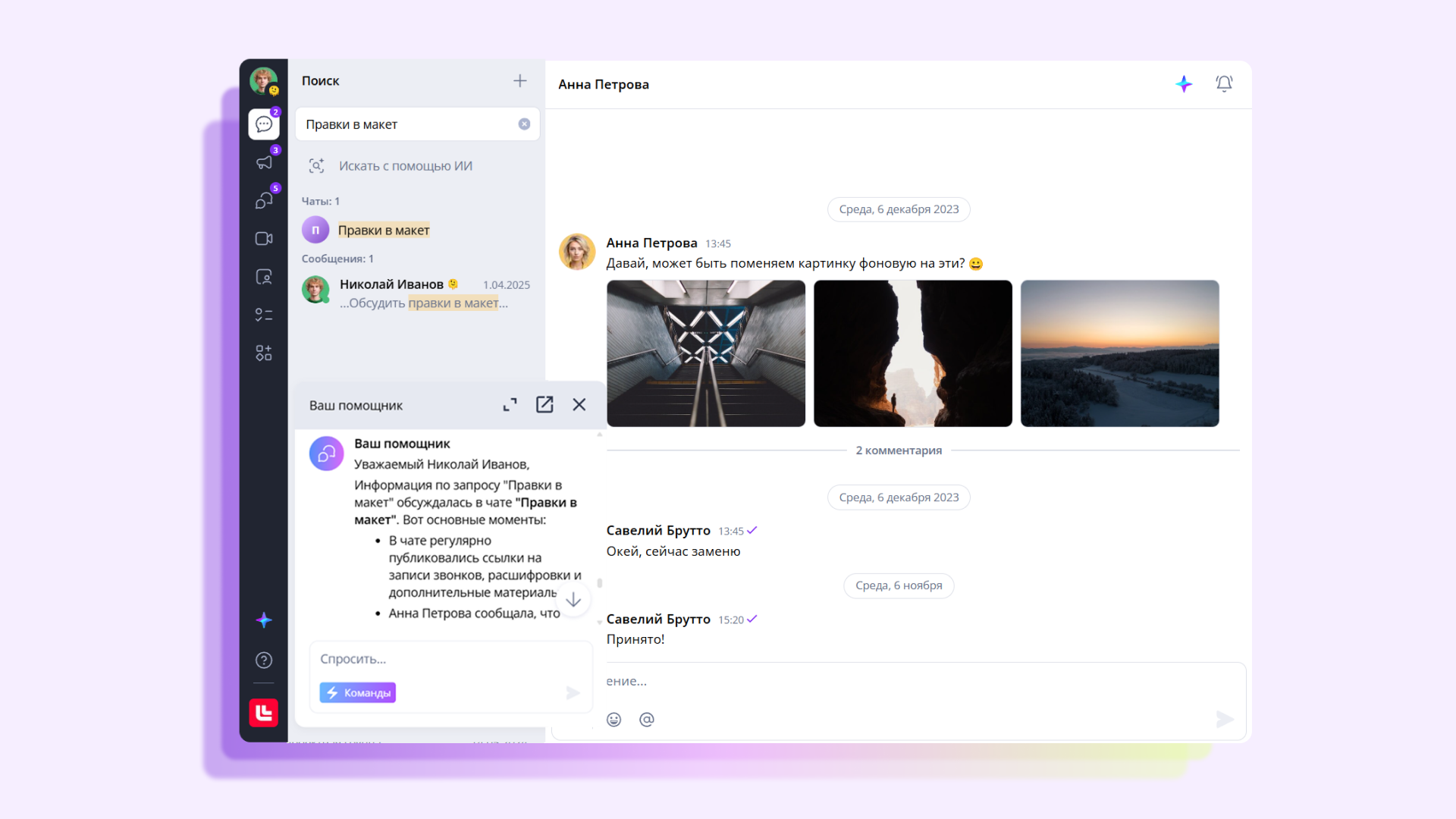 Сквозной ИИ-поиск позволяет задать любой вопрос в поисковике, например: «Кто в компании отвечает за стратегию?» или «Где посмотреть макеты сайта?» Алгоритм проанализирует все доступные вам переписки и выдаст ответ. В этом же окне можно продолжить взаимодействие с ИИ-помощником, например, уточнить, что обсуждалось на прошлой встрече, какие задачи вам ставили или какие сообщения вы пропустили.
