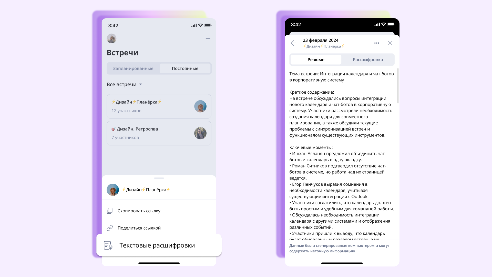 Текстовые расшифровки доступны и в мобильном приложении Чатов, чтобы ознакомиться с содержанием встречи можно было даже на ходу