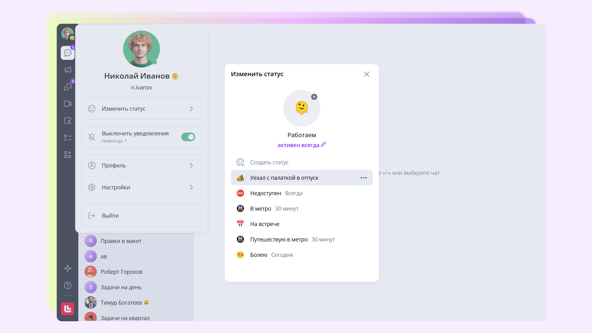 МТС Линк Чаты разработаны так, чтобы командам и их руководителям было удобно взаимодействовать друг с другом. Настраиваемые статусы покажут, что сейчас делает коллега: уехал в отпуск, работает над проектом или находится в дороге. Статус автоматически сменится на «На звонке», если будет начата встреча.