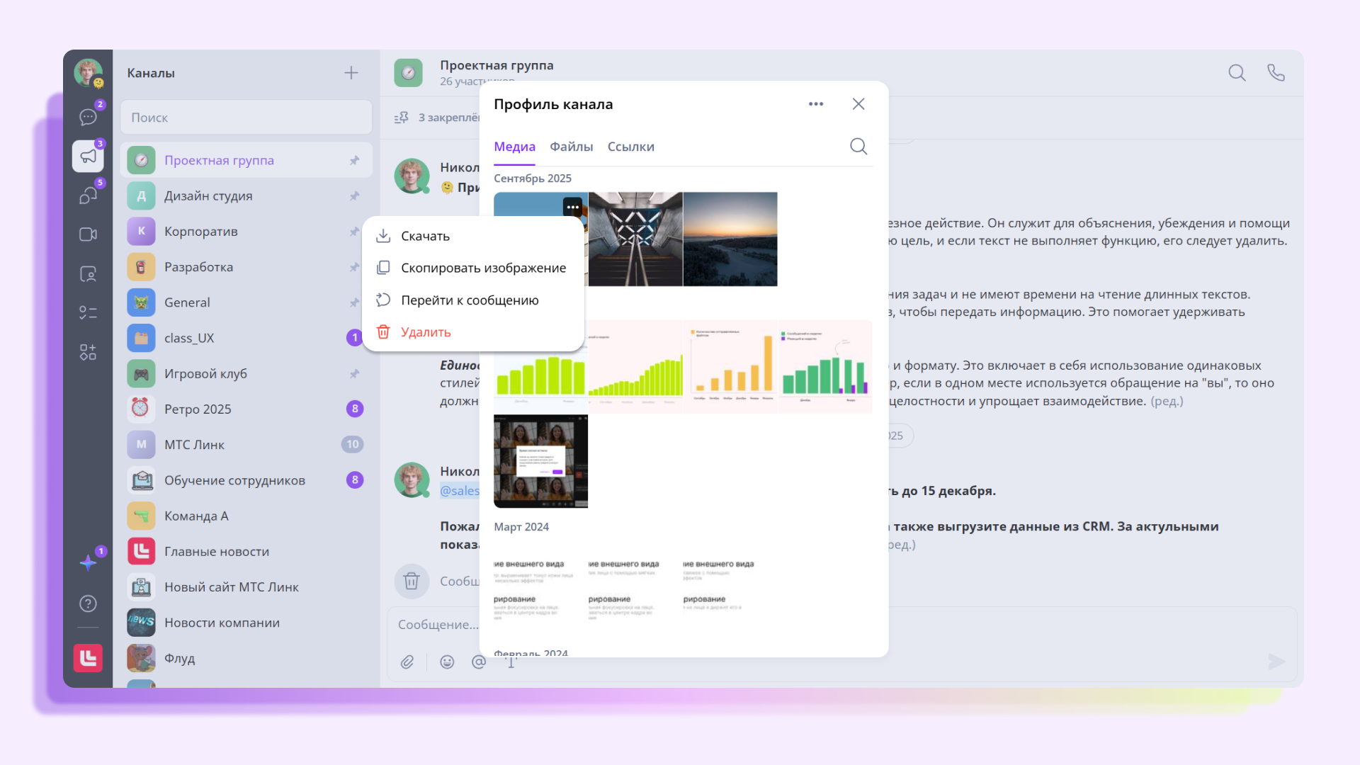 Пользователям доступно закрепление как самих каналов, так и сообщений внутри них. А медиатека со всеми отправленными файлами, изображениями и ссылками поможет найти презентацию, документ или макет в конкретном чате или канале.