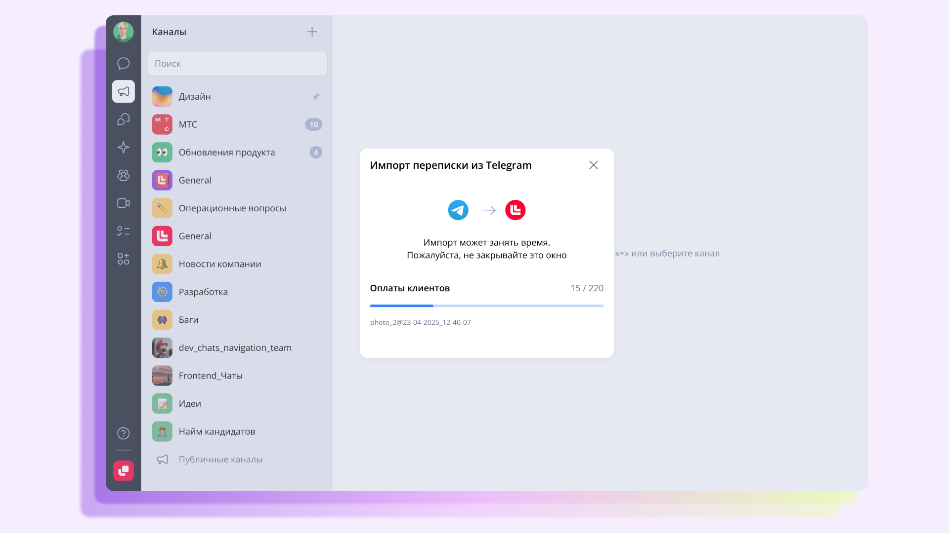 Корпоративный мессенджер поддерживает импорт переписки из Telegram. Так что вы можете создать резервные копии чатов и каналов, чтобы продолжить работу и общение в новом месте без ручного копирования договорённостей, файлов и ссылок.