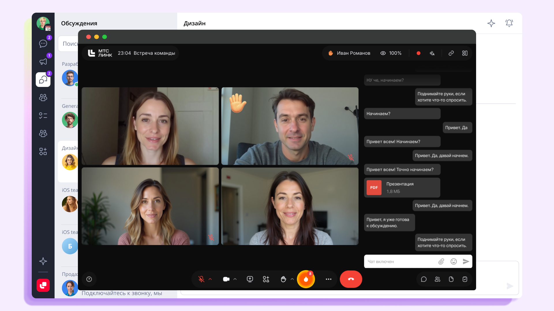 Начать звонок можно одним кликом из любого чата. Если вы звоните из канала, участники получают уведомление, а если из личного или группового чата — полноценный входящий вызов. Звонки работают через собственный сервис Встречи, и в МТС Линк Чатах доступны все его функции: шумоподавление, размытие фона, демонстрация экрана и показ презентаций. Также есть автоматические субтитры, которые переводят речь на 18 иностранных языков — это полезно, например, для международных встреч и собраний.