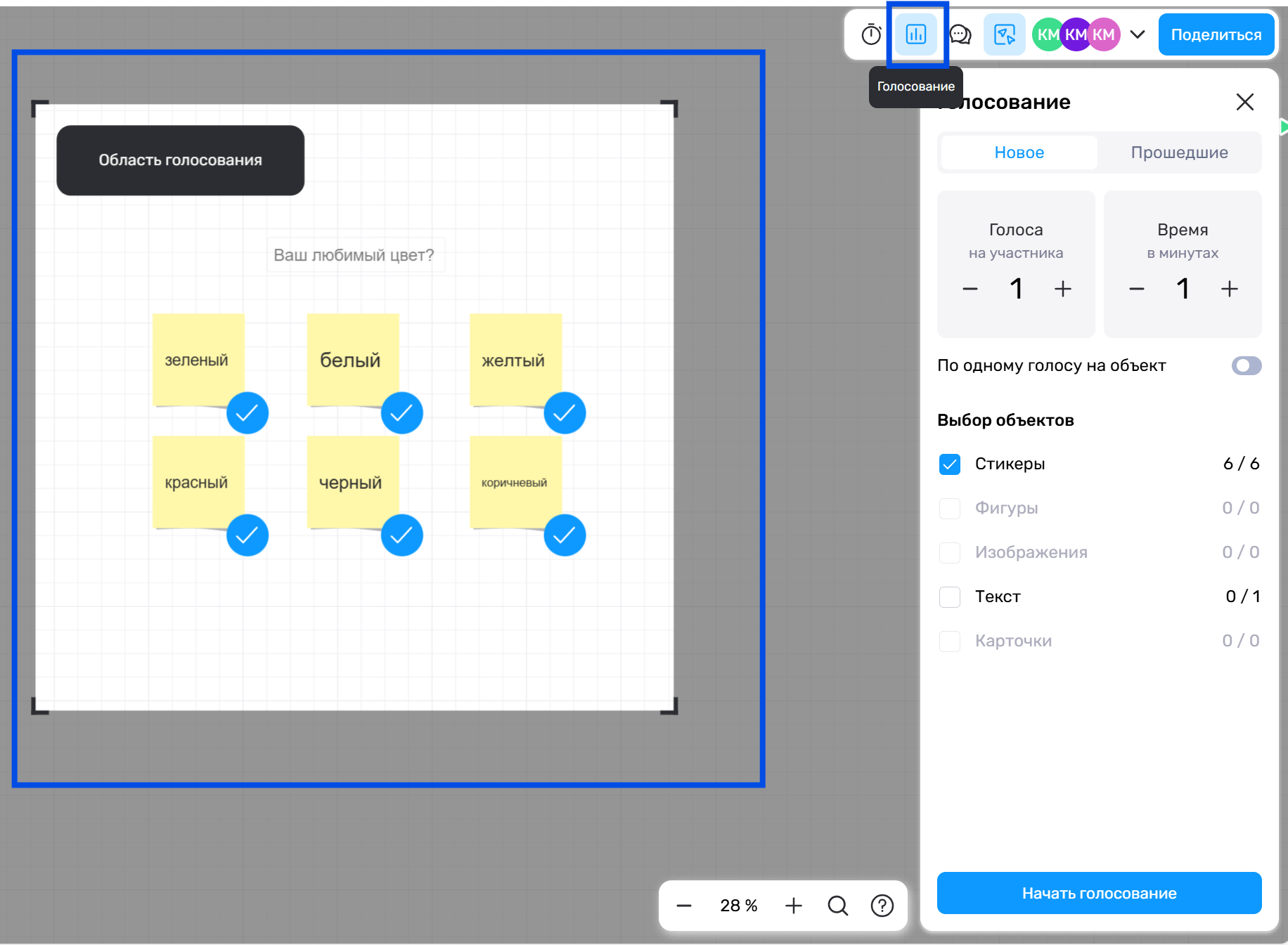 Пользователи доски могут голосовать за объекты и по итогам голосования определять лучшие варианты.