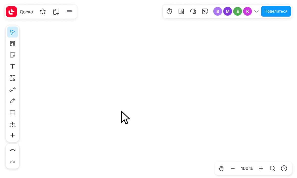 Если вы работаете на доске совместно с коллегами и хотите, чтобы они видели, в какой части онлайн-пространства вы находитесь, то можете воспользоваться функцией «позвать к себе». Подробнее о том, как работает функция, читайте здесь.