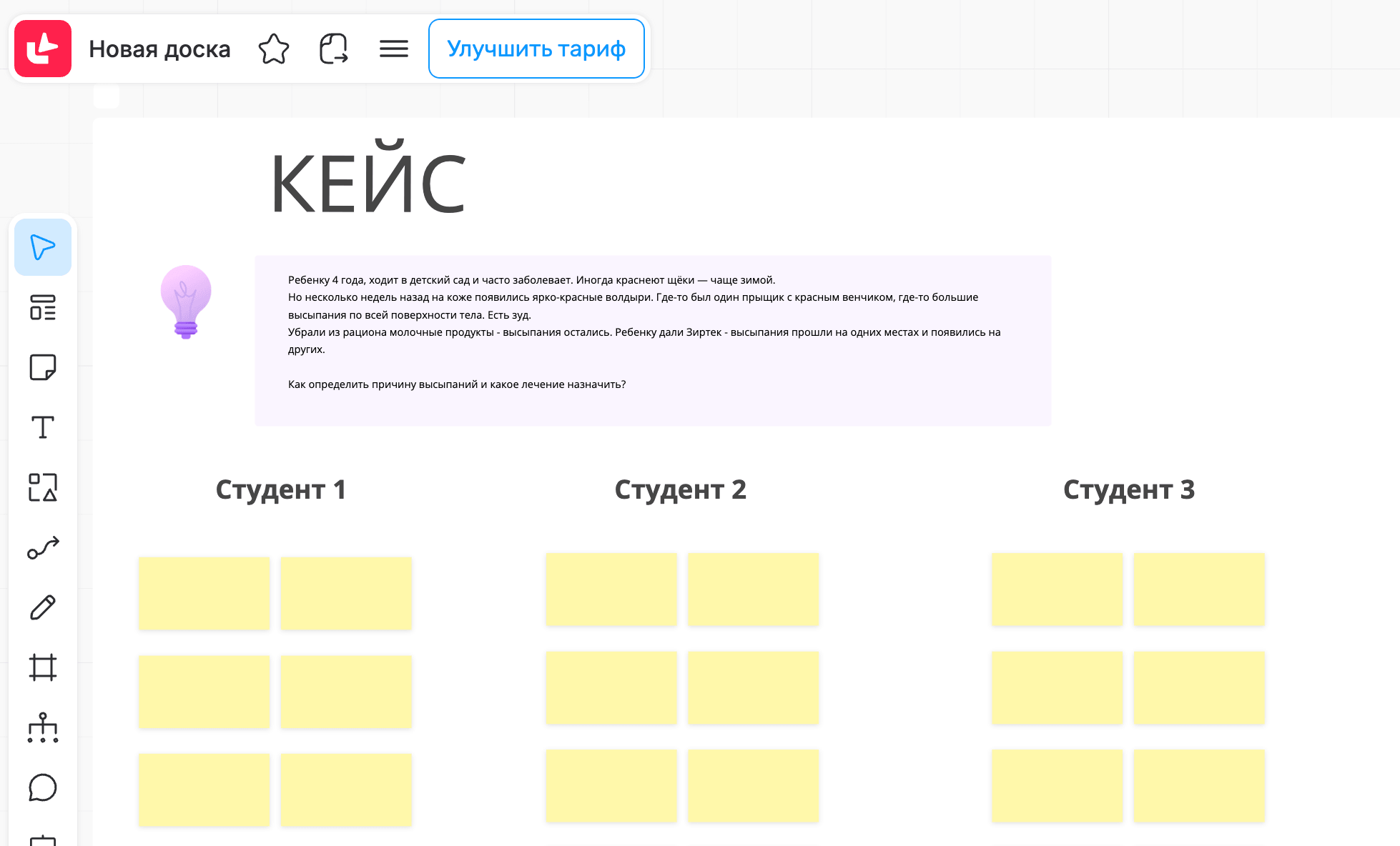 На онлайн-доске для совместной работы МТС Линк Доски можно визуализировать схемы и графики. Инструмент подходит для совместного решения медицинских кейсов и структурирования материалов, например при разборе порядка постановки диагноза.