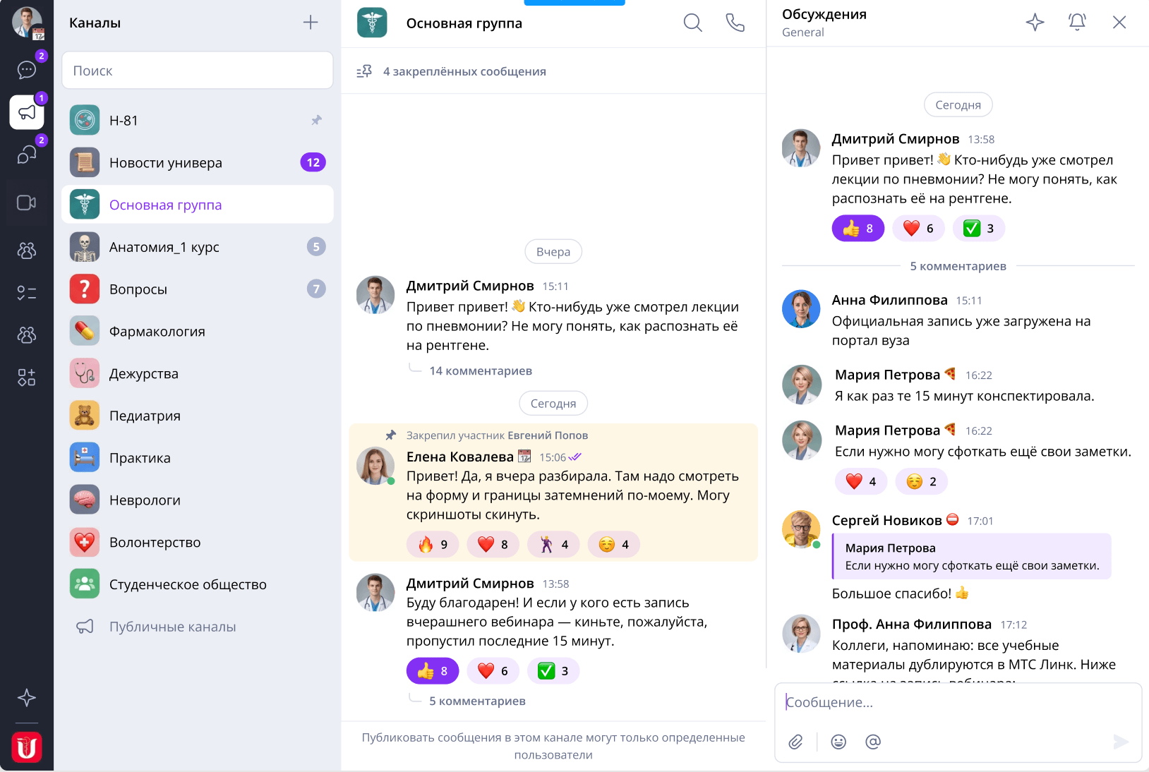 В корпоративном мессенджере МТС Линк Чаты студенты могут задавать вопросы преподавателям, обсуждать задания и получать новости об изменениях в расписании или сроках сдачи работ. В сервисе есть возможности создавать каналы, треды и отдельные групповые чаты — так важная информация точно не потеряется.