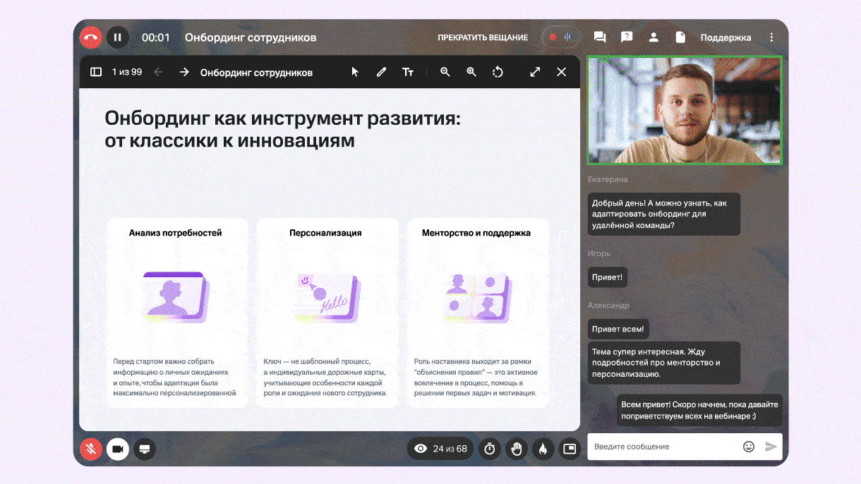 Если нужно провести дополнительную лекцию или обсудить вопросы, актуальные для всего потока, подойдёт сервис для онлайн-обучения и вебинаров МТС Линк Вебинары. Вся информация остаётся в записи: студенты могут пересмотреть занятие в любое время, а ИИ-ассистент подготовит расшифровку и краткое резюме.
