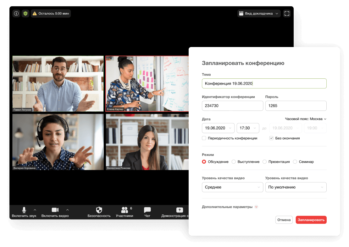 Одна из самых популярных программ для проведения онлайн-конференций, вебинаров и тренингов. Zoom обеспечивает качественную видеосвязь, подходит для совещаний на 100 человек. Чтобы начать работу, организатору и участникам нужно скачать ПО на сайте или в магазине мобильных приложений. Доступ на встречи можно ограничивать специальным паролем или предоставлять по ссылке без дополнительных условий. У платформы Zoom простой интерфейс, в ней есть набор всех необходимых для совещаний инструментов: