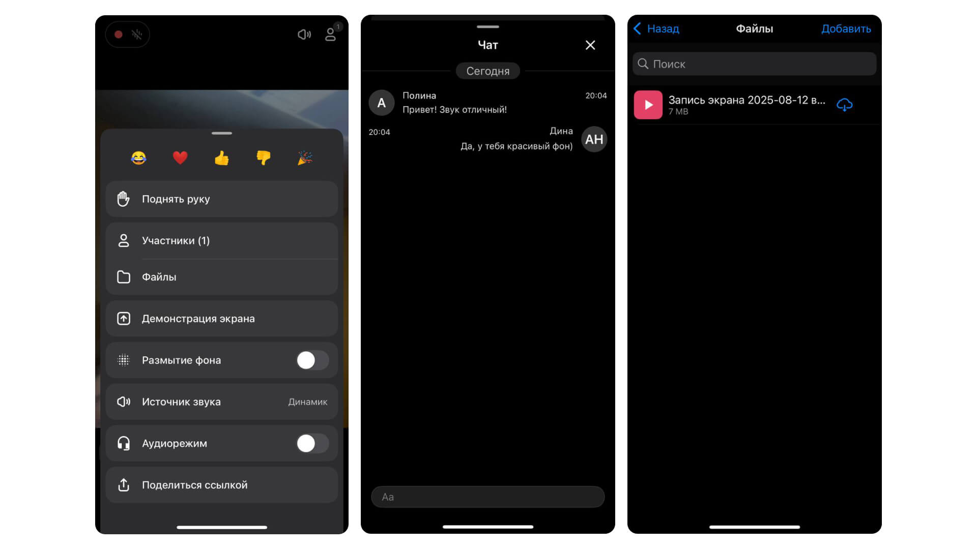 Во время встречи участники могут переписываться, обмениваться файлами, поднимать руку, демонстрировать экран, ставить реакции, размывать фон — функциональность идентична веб-версии платформы.