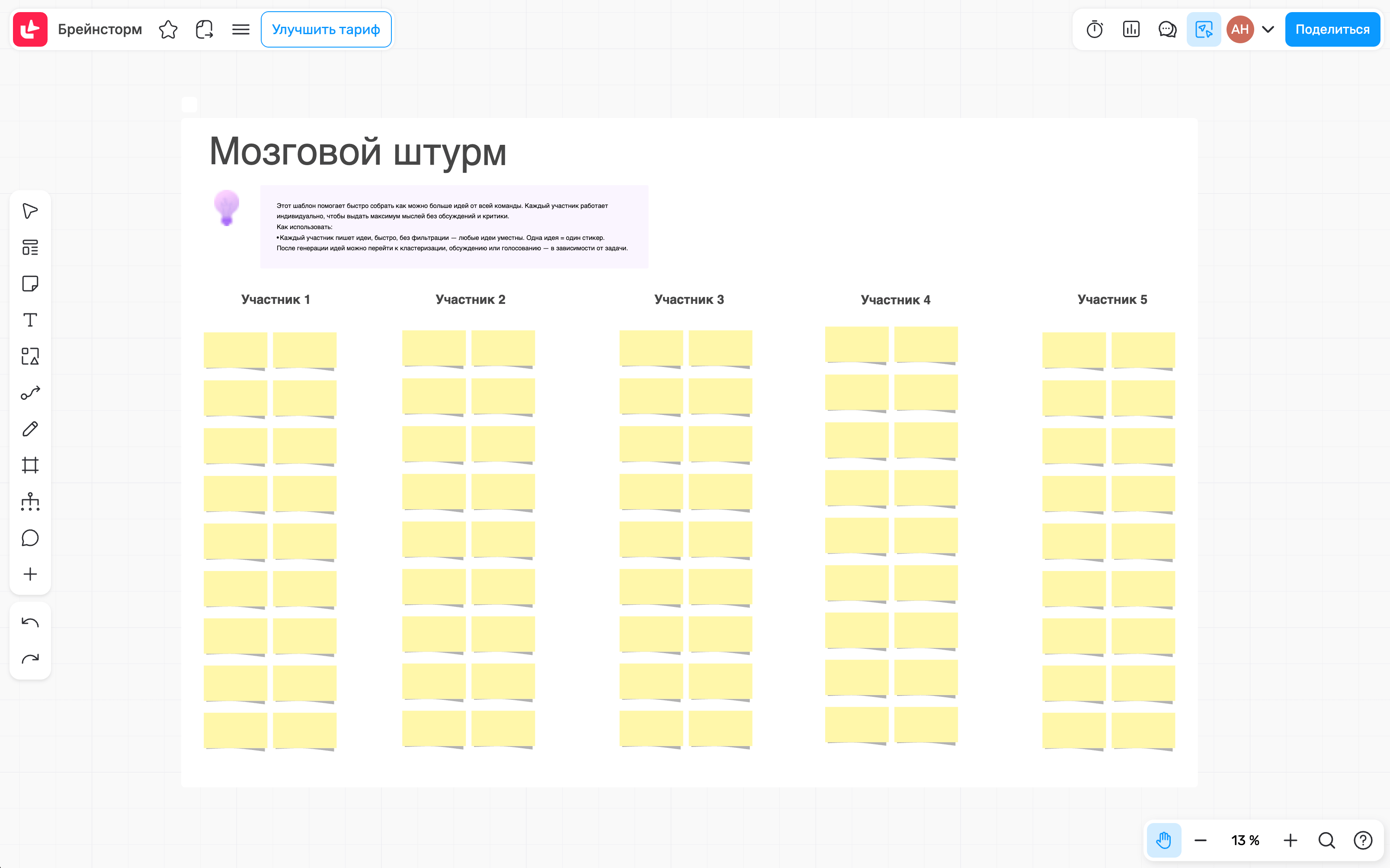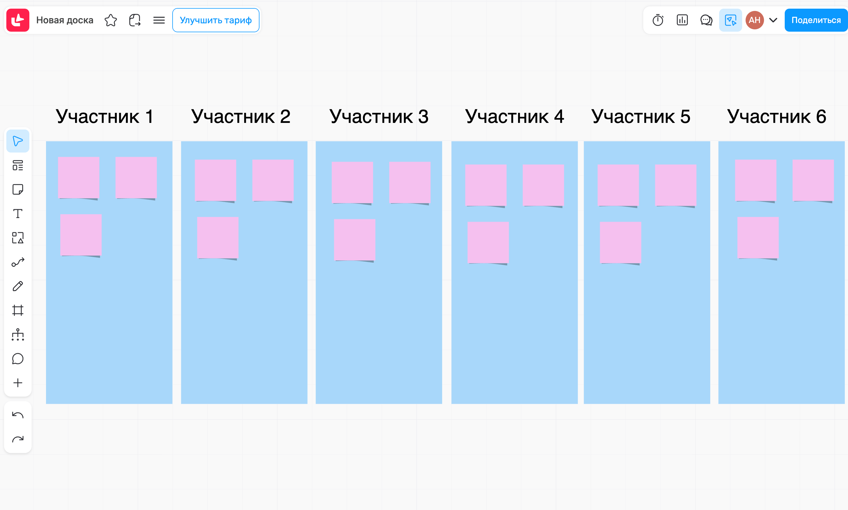 Провести «6-3-5» можно в сервисе МТС Линк Доски: создайте 6 колонок — по одной на каждого участника, — запустите таймер. По истечении пяти минут каждый переходит к чужому блоку, развивает идеи или добавляет новые.
