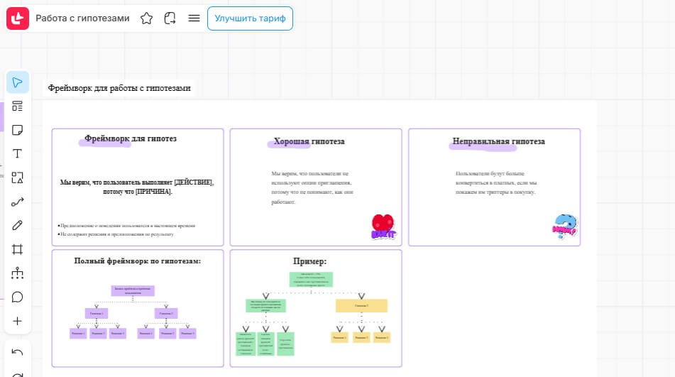 В МТС Линк Досках работу с гипотезами можно проводить в готовом одноимённом шаблоне. На встрече