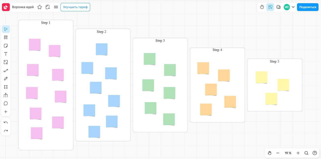 В готовом шаблоне «Воронка идей» в МТС Линк Досках идеи записываются на стикерах. Шаг за шагом команда отсеивает задумки.