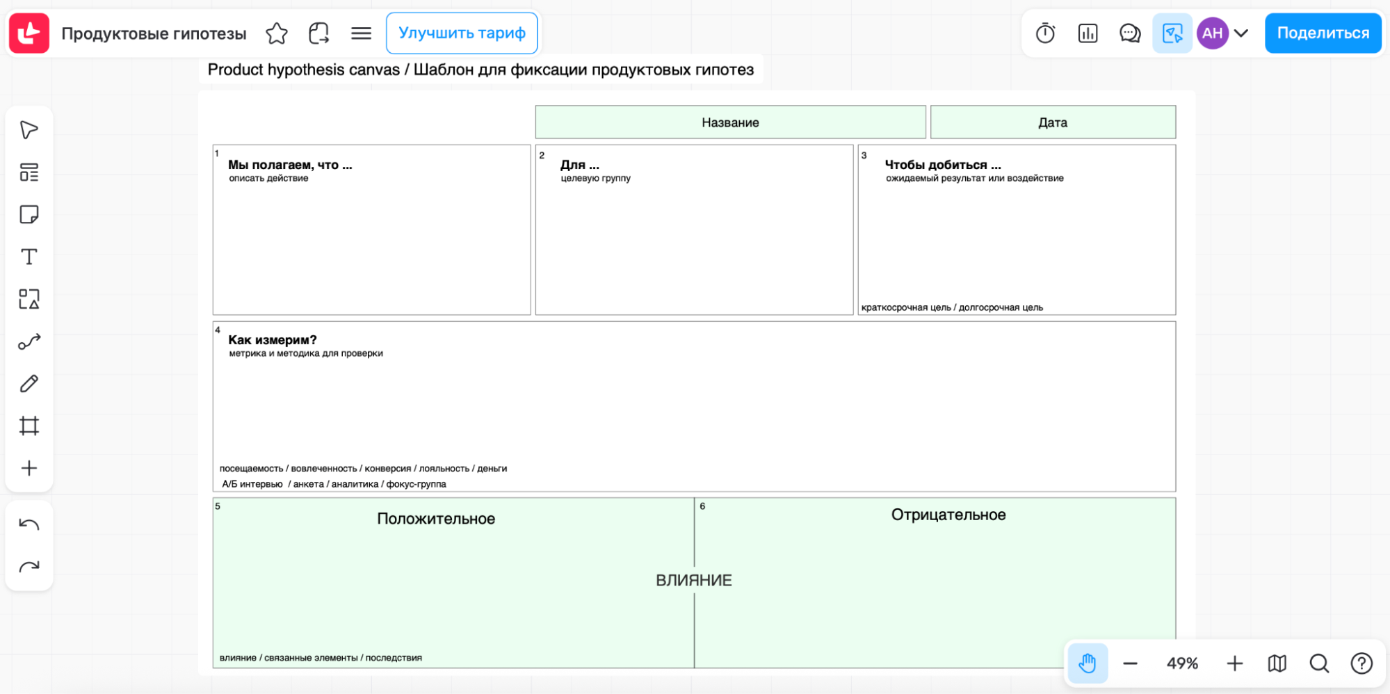 Готовый шаблон экономит время: не нужно тратить усилия на оформление структуры — достаточно открыть сервис и сразу заполнить разделы. На онлайн-доске для совместной работы МТС Линк Доски есть такой шаблон для работы с продуктовыми гипотезами.