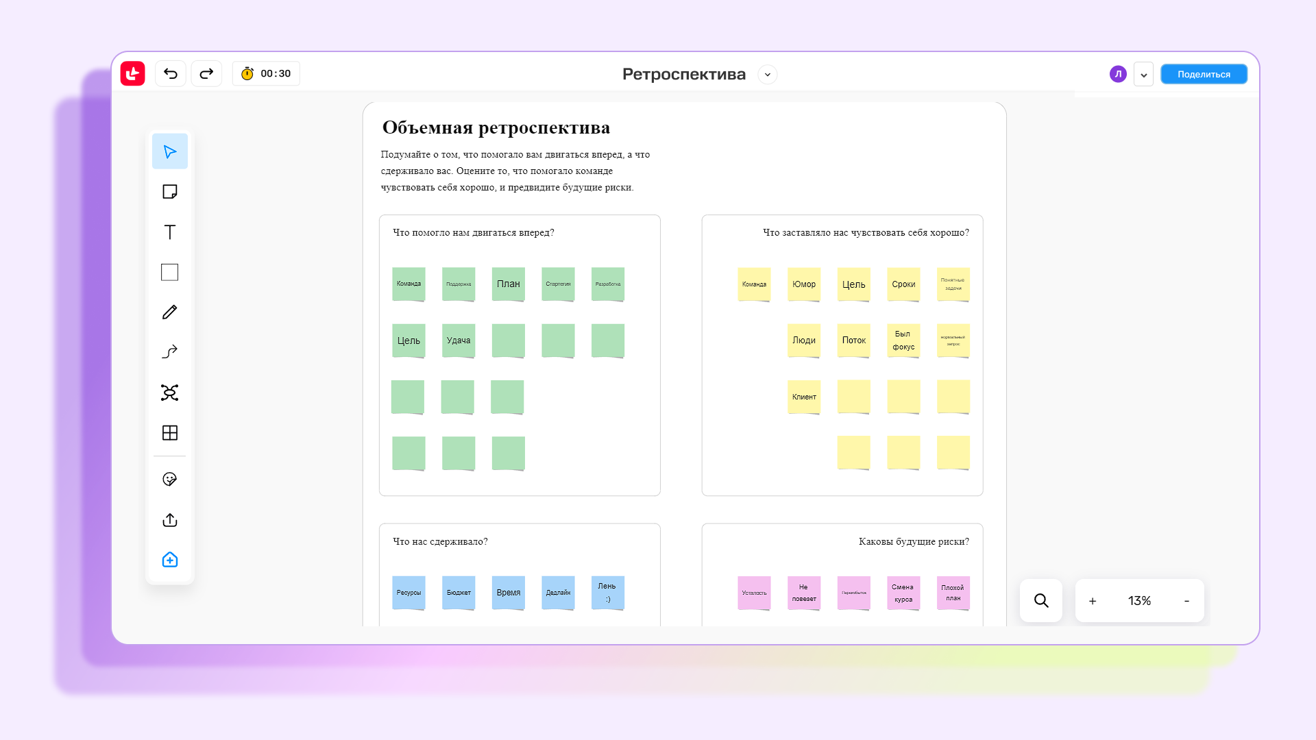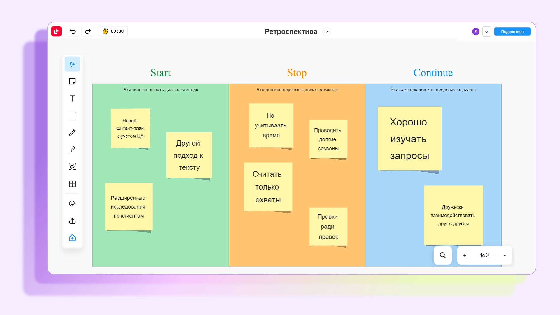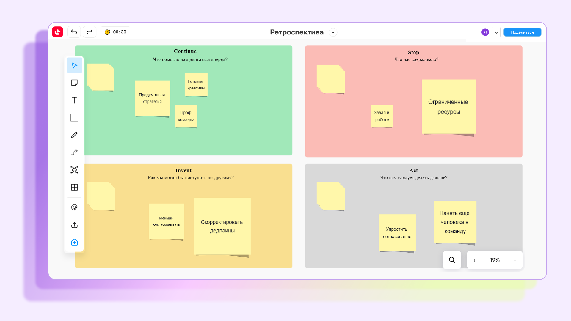 Провести ретро можно на видеовстрече, а заполнять стикеры и описывать работу — на онлайн-доске. В МТС Линк Досках вы найдете все нужные техники, инструменты и шаблоны для проведения ретро.