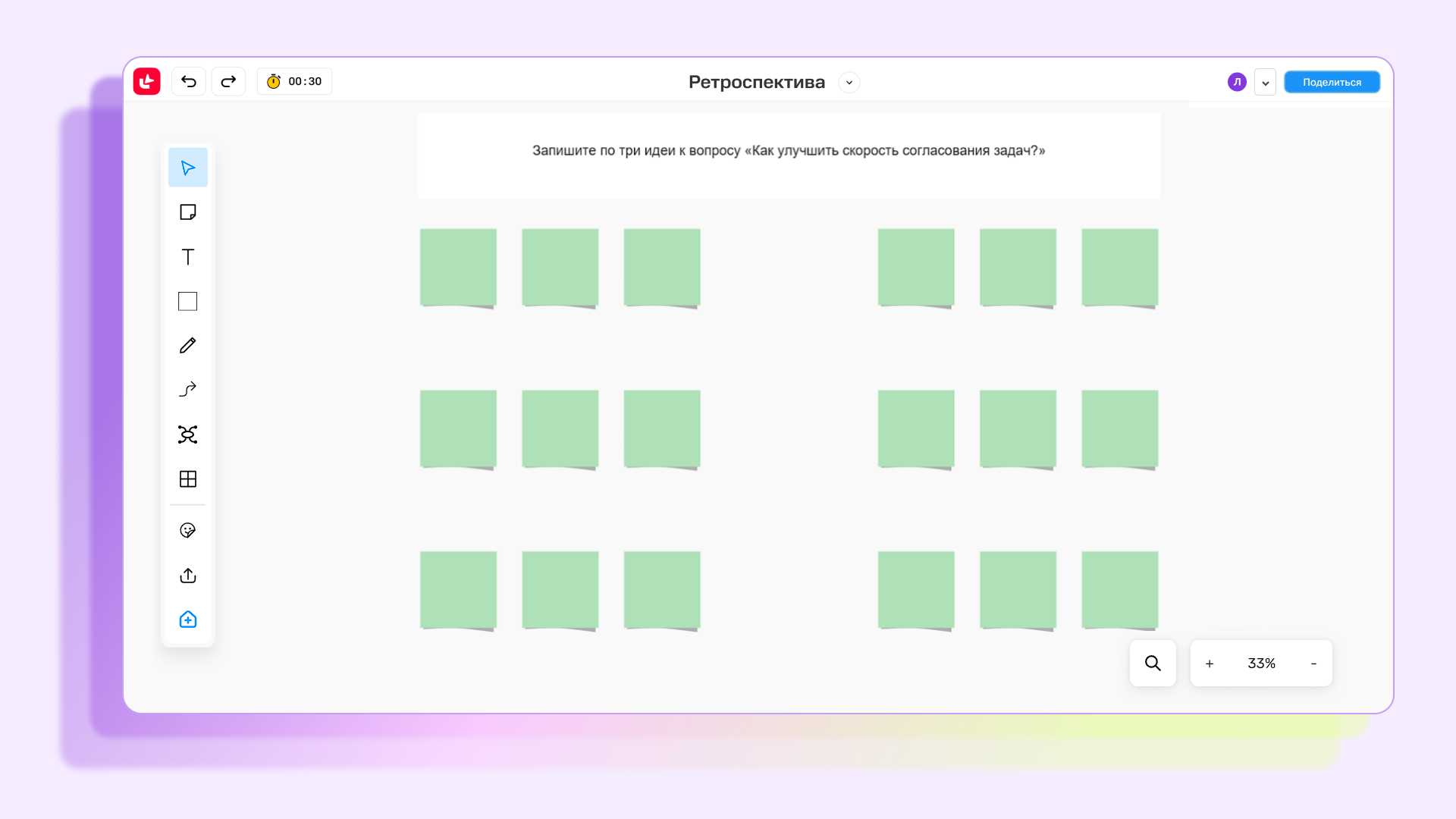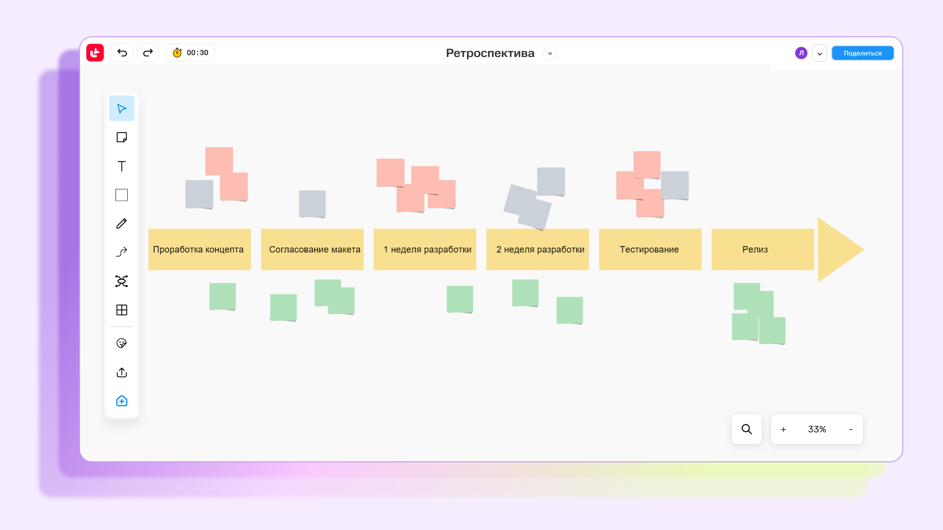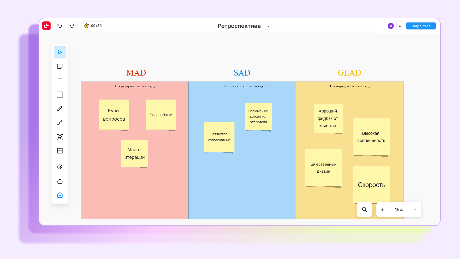 Провести ретро можно на видеовстрече, а заполнять стикеры и описывать работу — на онлайн-доске. В МТС Линк Досках вы найдете все нужные техники, инструменты и шаблоны для проведения ретро.
