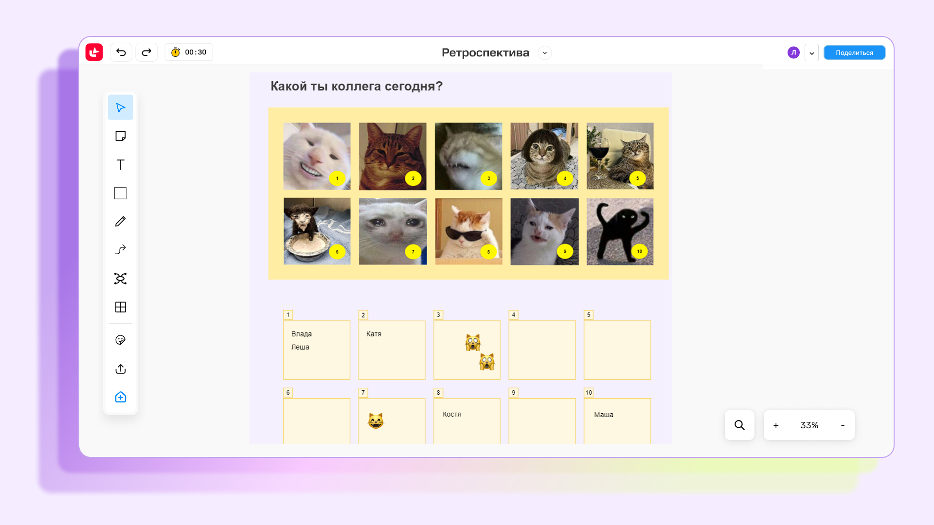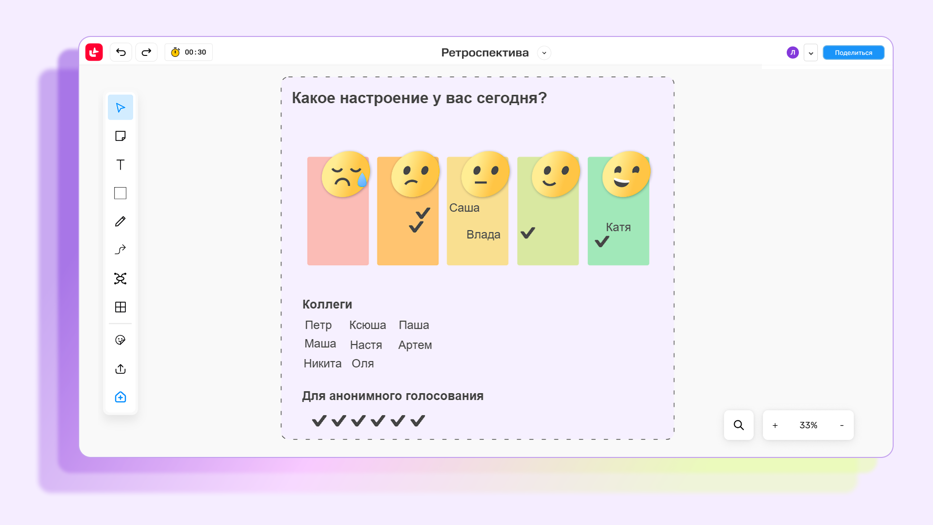 Помните, что ретроспективная встреча — это деликатное мероприятие, и она должна проходить комфортно для всех участников. Поэтому предлагайте анонимные голосования, когда можно не подписывать свой выбор, а обозначать его стикерами и эмодзи.