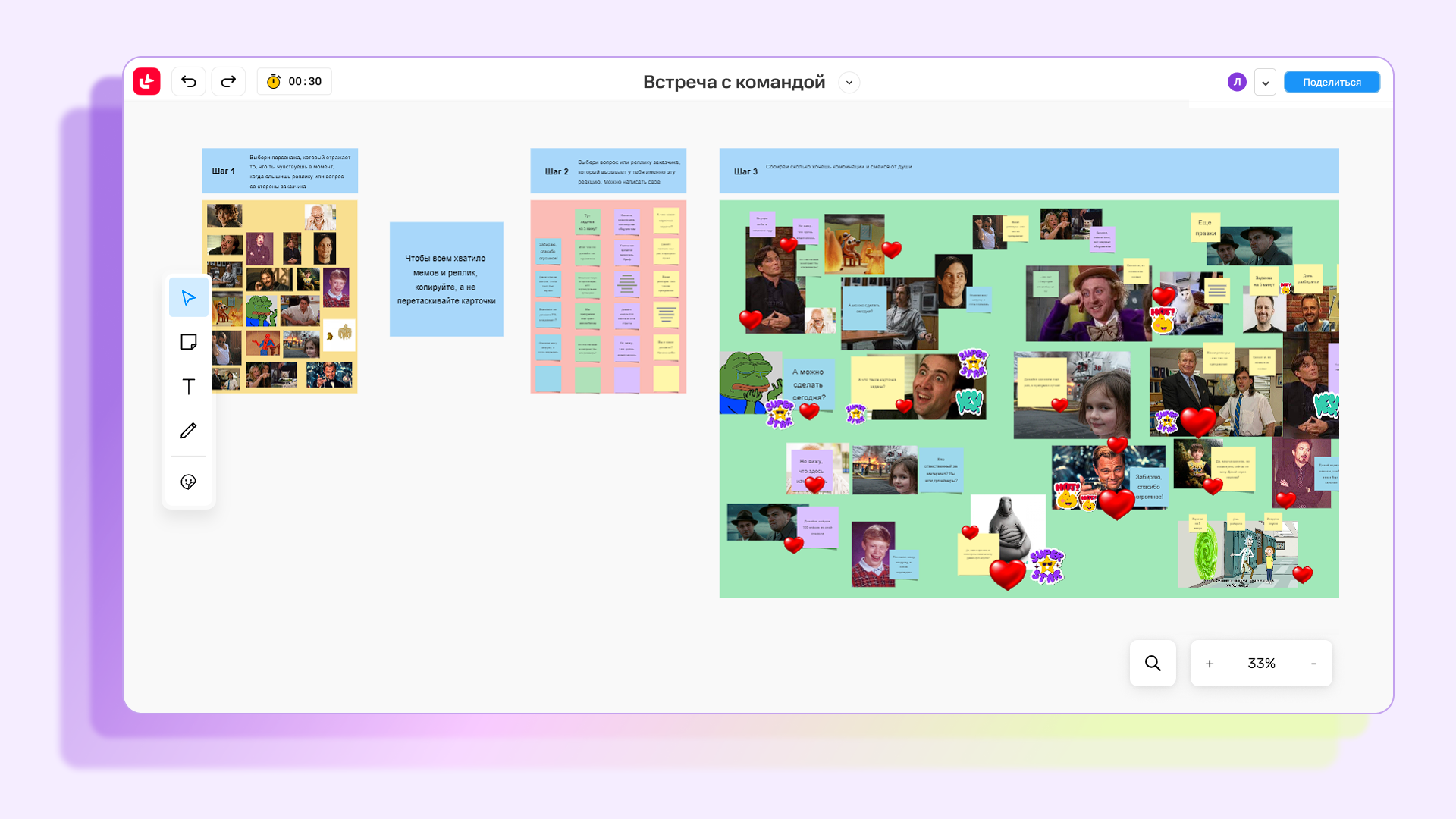 Для генерации идей подойдут любые техники брейнсторма. Например, классический брейнрайтинг, на котором каждый участник за пару минут пишет по три идеи решения. Стикеры можно заполнять сразу, а можно передавать по очереди друг другу, чтобы участники решали, что с ними делать: дополнять, менять или передавать дальше.