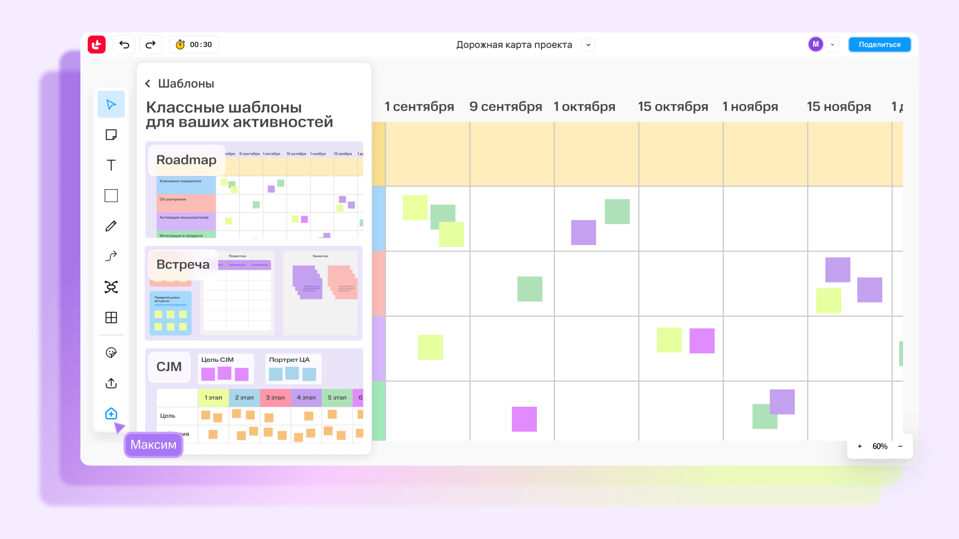В МТС Линк Досках есть шаблон для роадмапа проекта и других командных инструментов. Чтобы начать работу над дорожной картой, нужно просто выбрать подходящий шаблон в библиотеке.