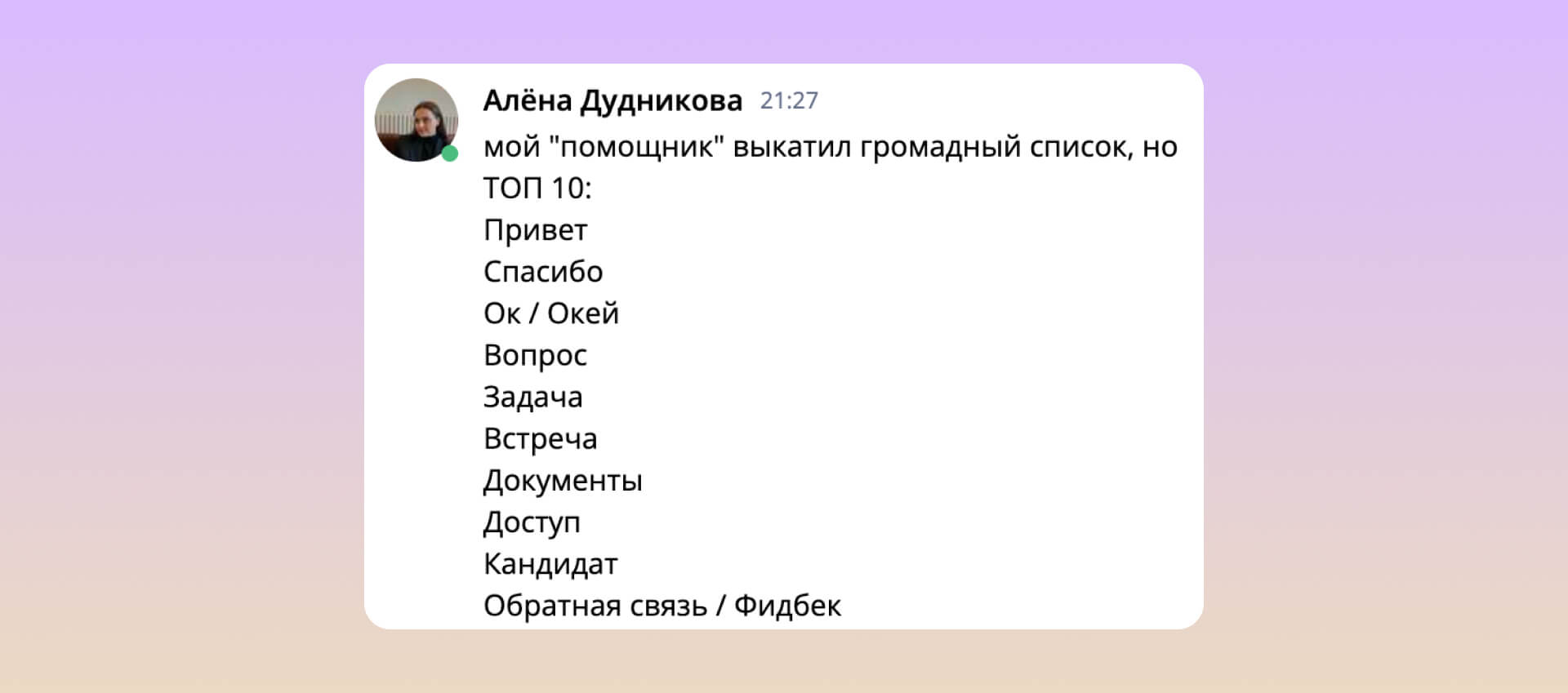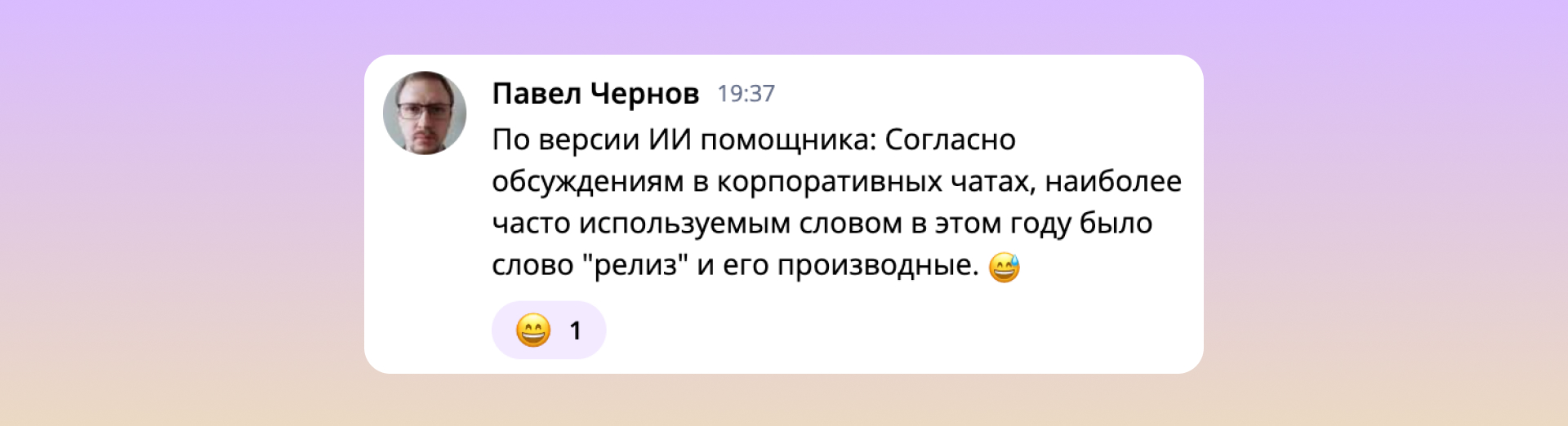 В чате с помощником наш тестировщик ввёл промпт: «Какое слово в этом году я использовал чаще всего». ИИ-ассистент проанализировал все сообщения за год и подвёл итог: слово 2025 года — «релиз».