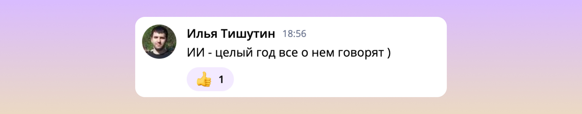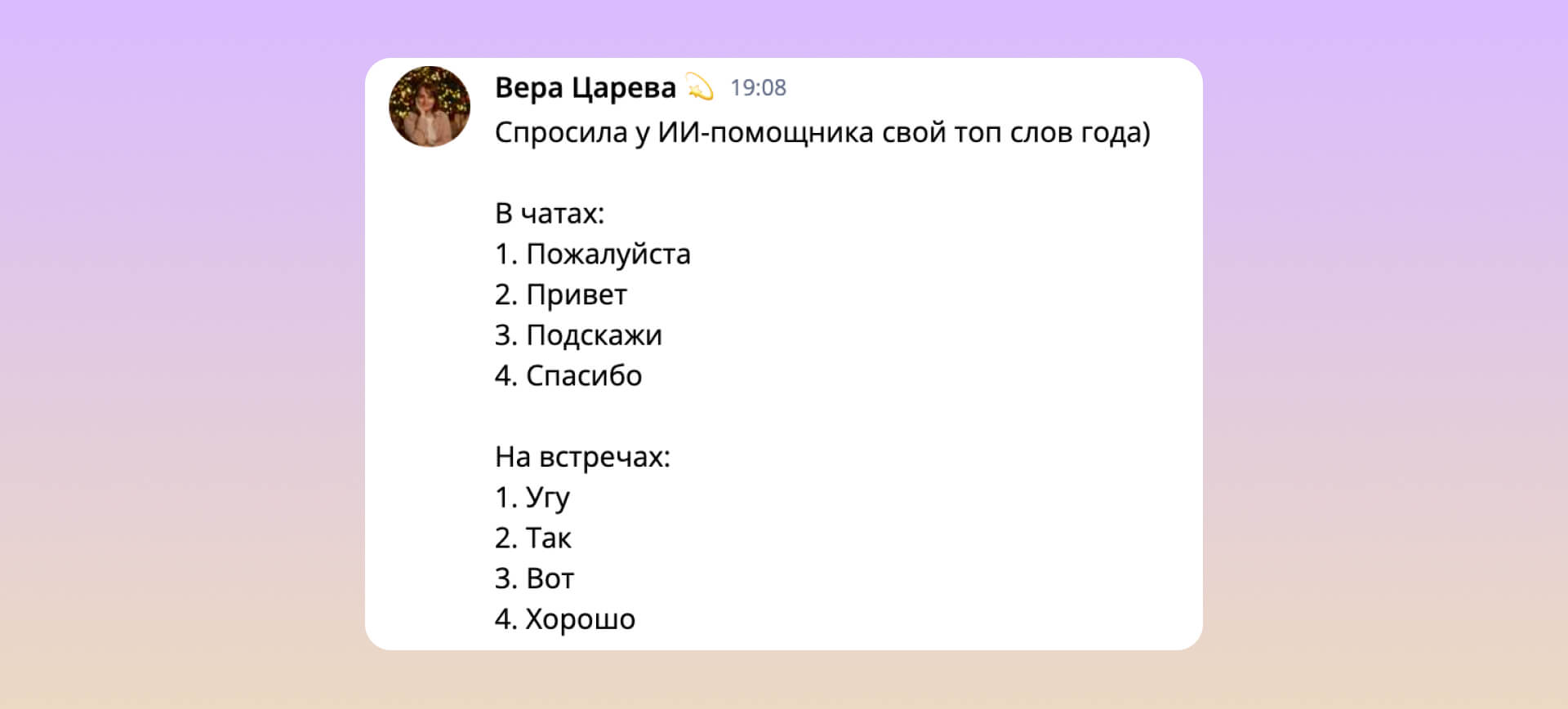 Чтобы точно определить слово года, в команде разработки обратились к ИИ-ассистенту в сервисах МТС Линк. Виртуальный помощник анализирует чаты и записи встреч, в которых участвовал пользователь. На основе этих данных ассистент отвечает на вопросы человека.