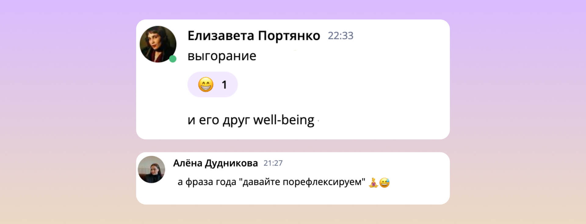 HR-менеджеры и специалисты по привлечению талантов не давали выгоранию сломить наши команды. Поэтому одно из слов года было well-being (программа корпоративного благополучия для сотрудников), а главная фраза — «давайте порефлексируем».