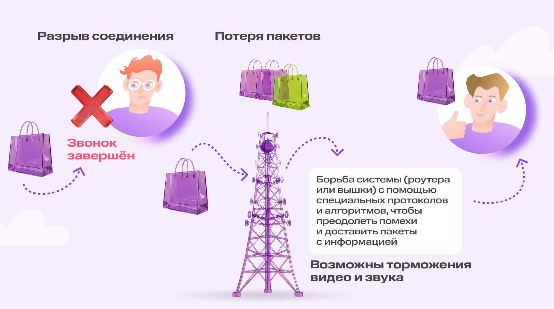 Пакеты — блоки данных, которые передаются по сети между пользователями. Например, видео и звук собеседников. Часто именно потерю пакетов с информацией воспринимают за сбой, хотя это не совсем так. Низкая скорость — это ограничение канала, а разрыв соединения — полное отсутствие связи. А вот потеря пакетов — это плохой сигнал из-за помех.