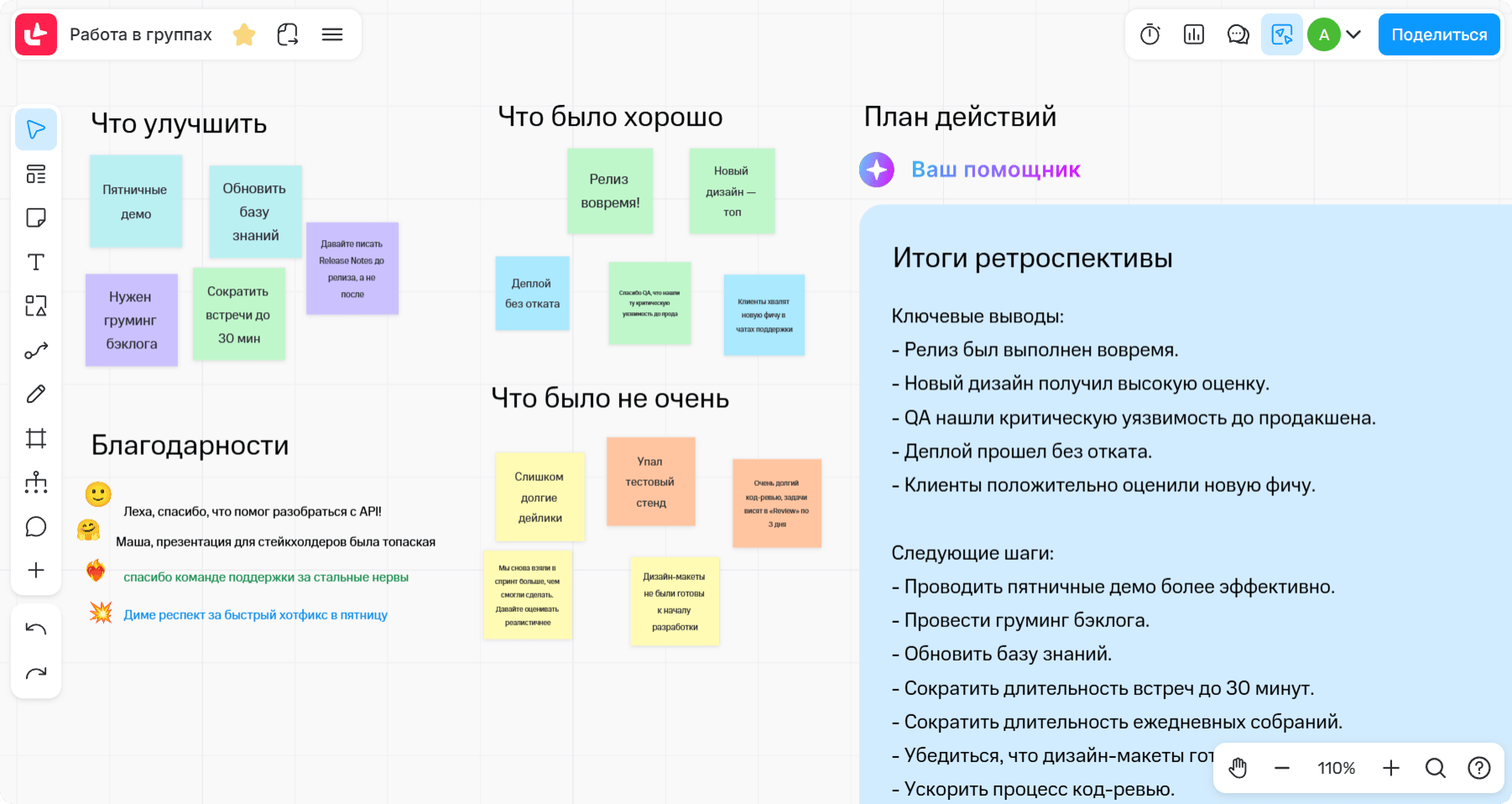 Составление плана действий — финальный и важнейший шаг в ретроспективе. Но анализ информации на стикерах, которые заполняли участники, может занимать время. Функция «Итоги ретро» в ИИ-помощнике поможет получить краткий список ключевых выводов и следующих шагов по пунктам за пару кликов. Это позволит начать работать сразу после проведения ретро.