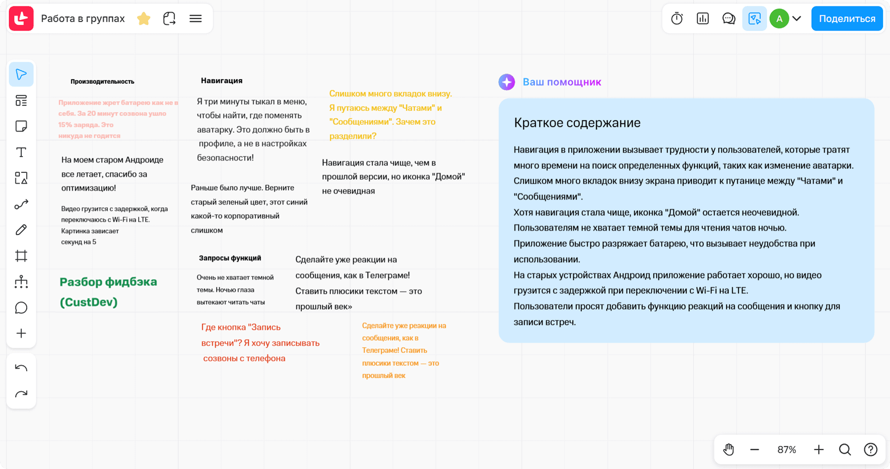 Когда онлайн-доска переполнена идеями после бурного обсуждения, бывает сложно подвести итоги. Функция «Краткое содержание» проанализирует контекст всех заметок и сформирует из них ёмкое резюме. Например, поможет собрать даже сотню идей с мозгового штурма в одну заметку или превратит массив пользовательских цитат с кастдева в структурированные выводы.