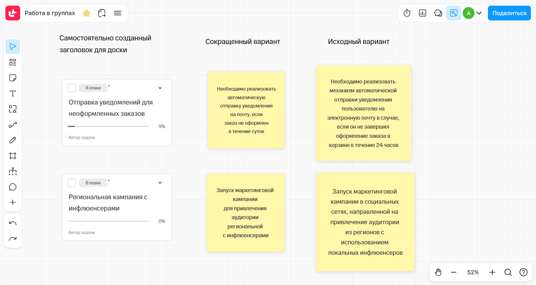 Онлайн-доска — это визуальный инструмент, где место на экране — ценный ресурс. Длинные тексты перегружают схемы и мешают восприятию. Функция «Сократить» сжимает абзацы до коротких заметок, заголовков или пунктов списка, сохраняя главный смысл. Это делает описания в роадмапах, канбан-досках и стикерах компактными и удобными для чтения.