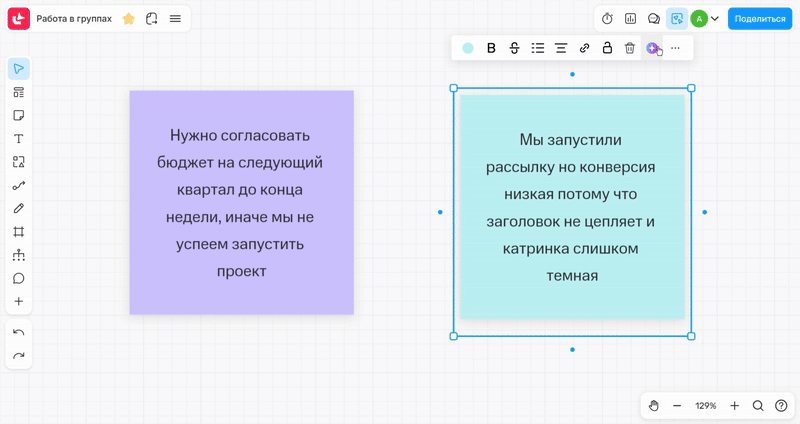 Текстовый ИИ-помощник в интерактивной доске позволяет создавать готовое саммари, отчёт или план действий по информации на стикерах, в карточках и заметках. Теперь не обязательно вручную разбирать предложения коллег и свои заметки — ИИ проанализирует контент и подведёт итоги.