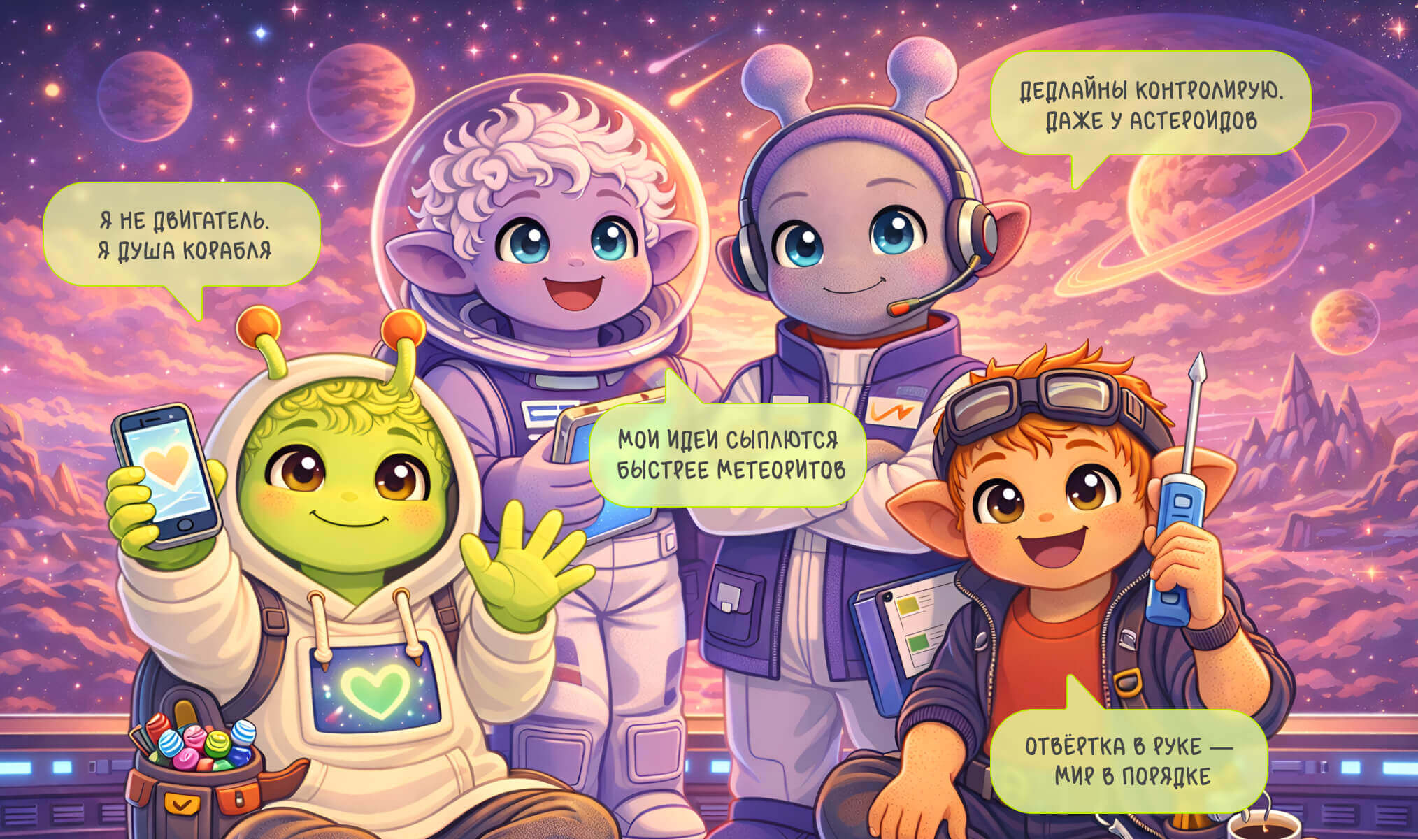 Ничего необычного: вас всем офисом отправляют на космическую миссию. Задач — как звёзд на небе — очень много. Вам уже раздали скафандры и распределили роли в экипаже — в зависимости от навыков, характера и стиля коммуникации. Пройдите тест и узнайте, кем вы станете на борту станции. Бонусом получите рекомендации, как выйти на космический уровень общения.