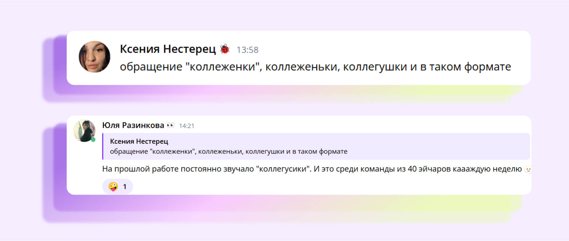 «Коллегушки» вызывает особое неприятие — оно ассоциируется с чем-то неестественным и даже комичным, подобно словам «котятки» или «рыбки». Это плохая деловая фраза.