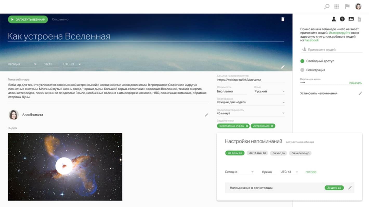 Нам важно понимать, насколько интересной была тема лекции, какой из докладов имел наибольший отклик, кто именно из пришедших на вебинар досмотрел его до конца. Статистика мероприятий на платформе Линк Вебинары помогает нам анализировать поведение пользователей, улучшать коммуникацию и находить потенциальных клиентов среди наших слушателей. Элина Телепенина, руководитель отдела мероприятий.