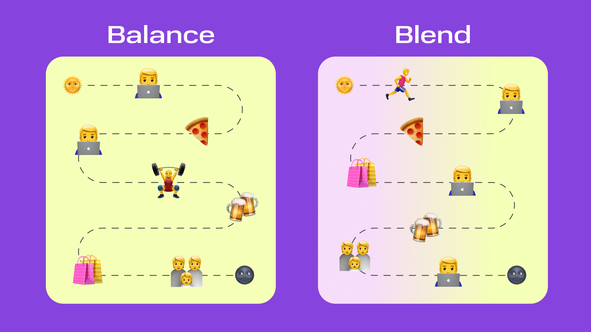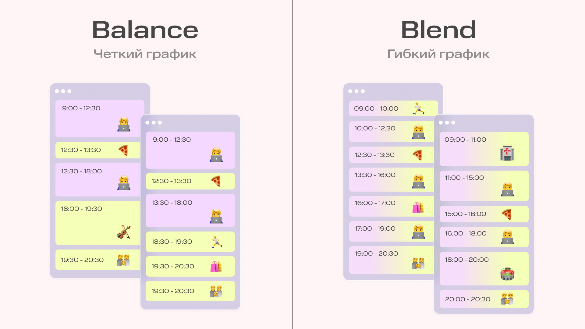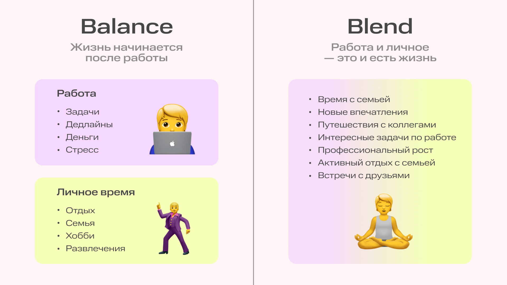 Если по work-life balance вы ставите работу и личное в противоположности, то в blend начинаете сочетать профессиональное и личное время. Успехи на работе положительно сказываются на личной жизни: вы чувствуете себя уверенней и счастливей, а хороший отдых помогает переключаться и набраться сил для достижения новых целей.