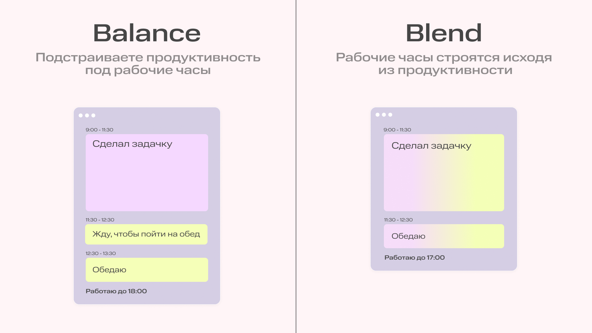 - Концепции «бленд» и «баланс» нужны для того, чтобы получать удовольствие от жизни и работы. Разница только в подходе к управлению временем и ресурсами. Используйте вариант, который вам больше подходит, чтобы достигать большего и уделять время себе, семье и друзьям.