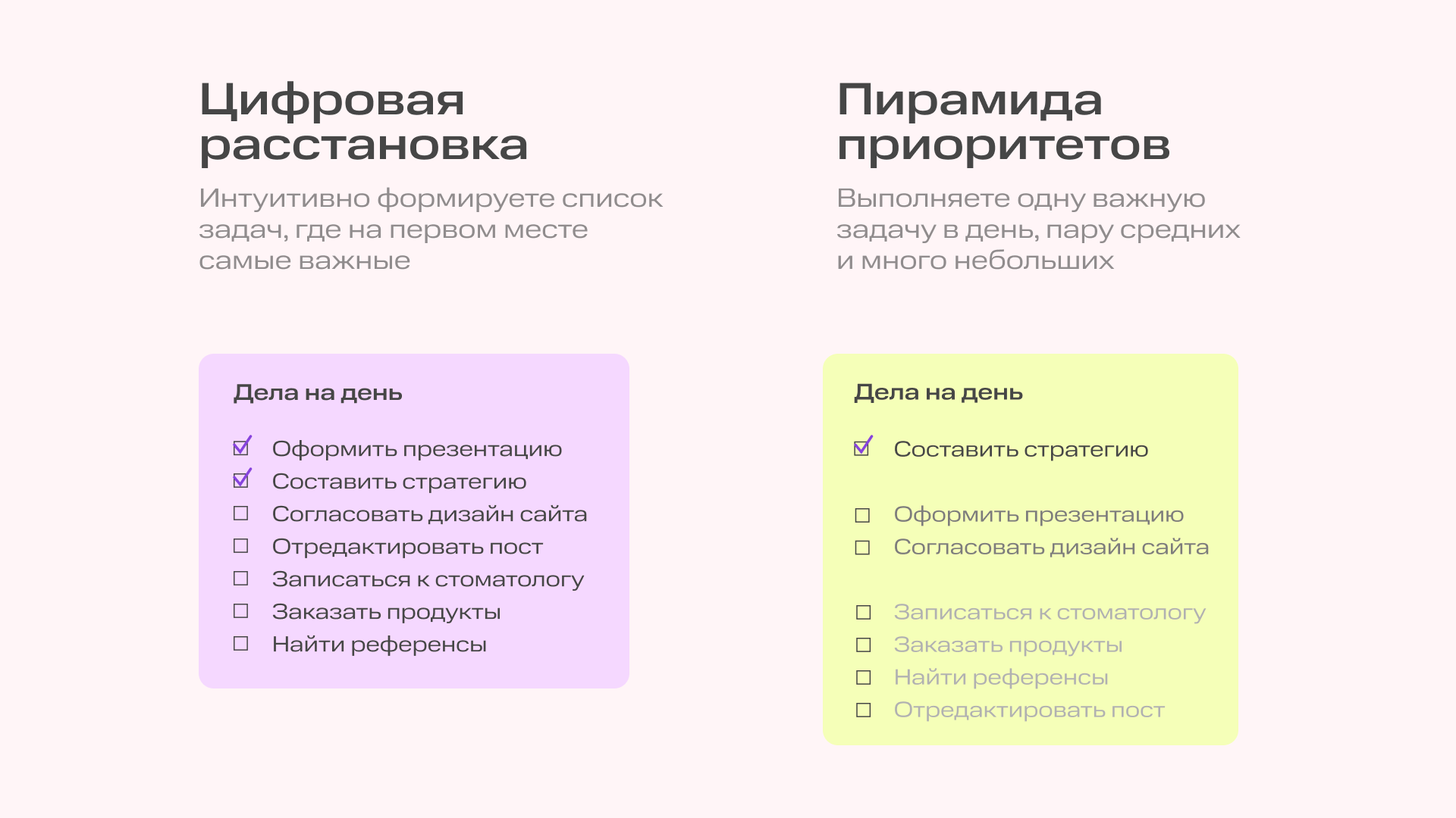Расстановка. Интуитивно формируете список, где на первом месте самые важные цели. Выполняете по порядку и не переходите к следующей, пока не выполнена прошлая. Можно чуть улучшить и сделать пирамиду приоритетов: в день выполняете одну большую задачу с высоким приоритетом, несколько средних и множество маленьких. Всё, что было не выполнено, переносится на завтра.