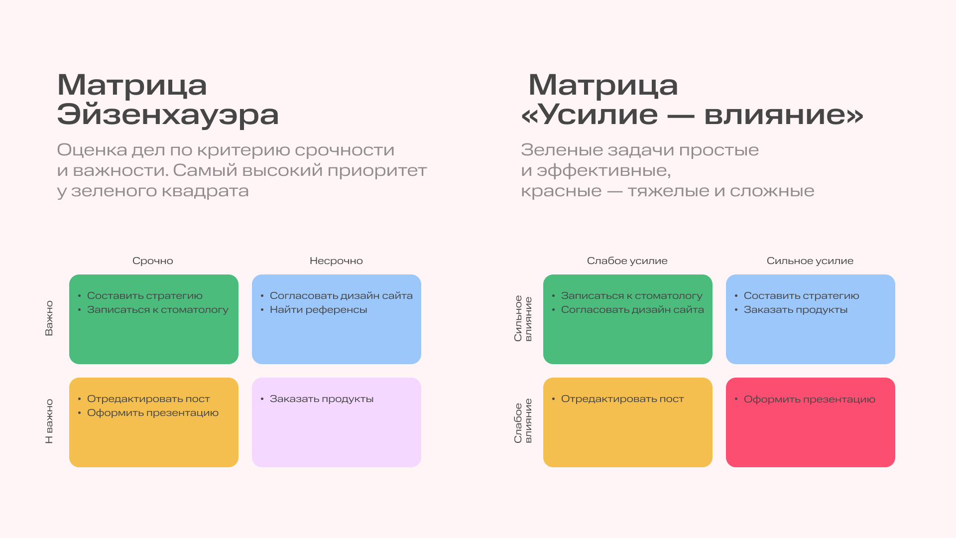 Матрицы. Техники, на которые придется потратить немного больше времени. По матрице Эйзенхауэра вы сможете определить важность и срочность дел и понять, за что браться в первую очередь. Матрица «Усилие — влияние» поможет выбрать дела или задачи, которые принесут больший результат за минимум усилий.
