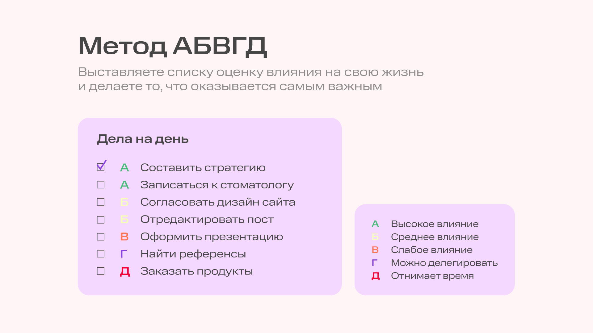 Оценка влияния. Самый простой метод — АБВГД, по которому вы оцениваете влияние дел на свою жизнь. Интуитивно даете оценку и выполняете то, что имеет самый высокий приоритет.