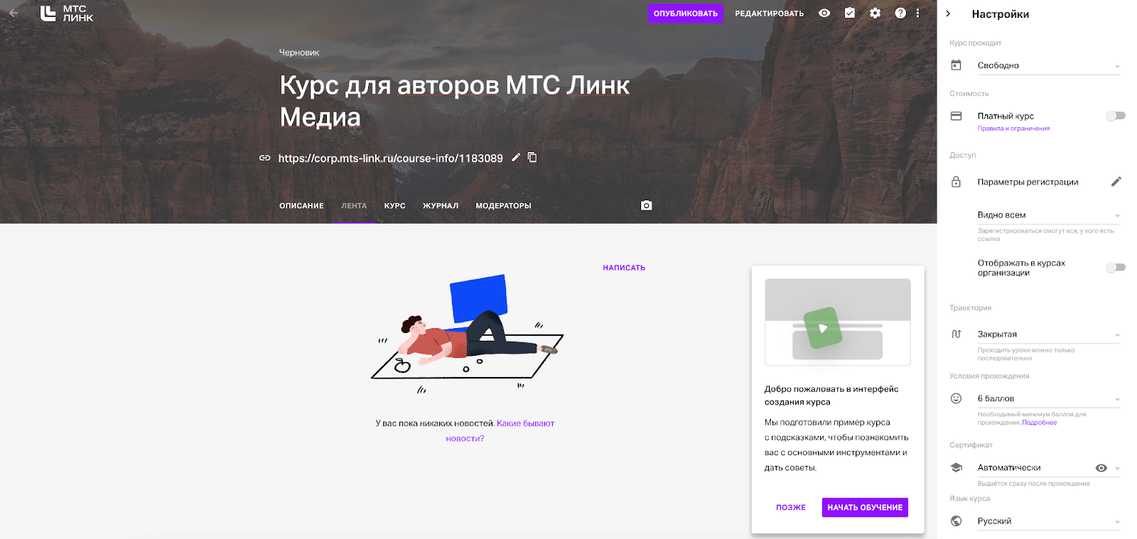 Собрать курс, добавить в него видео- и аудиоматериалы, статьи и тесты можно в сервисе для создания онлайн-курсов и организации обучения МТС Линк Курсы. Авторам доступен интуитивно понятный редактор. Можно создать курс с нуля, а можно собрать его по готовому шаблону. Подробнее об этом написали в обзоре сервиса.