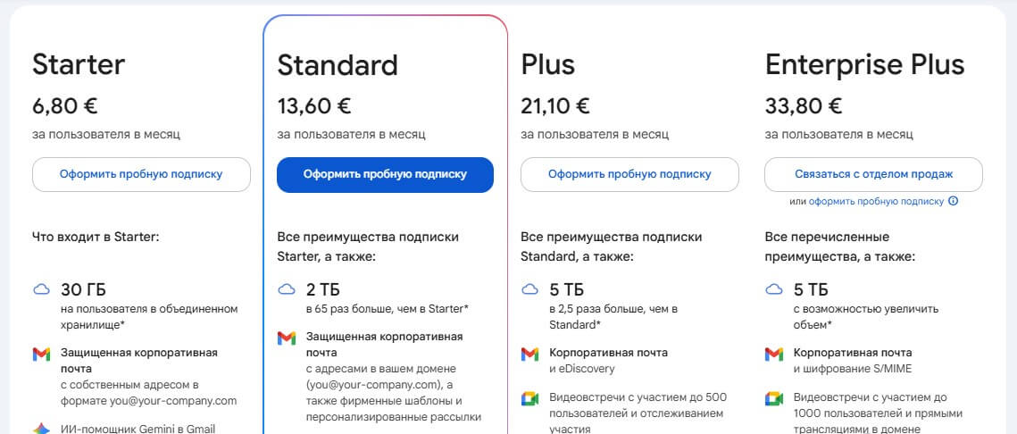 Важный момент — функция доступна только с компьютера, из браузера Google Chrome. Пользователям мобильной версии сервиса и приложения Google Meet придётся устанавливать сторонние программы. Кроме того, подключение функции возможно только из платных учётных записей Google Workspace (G Suite). Приводим цены 2025 года: