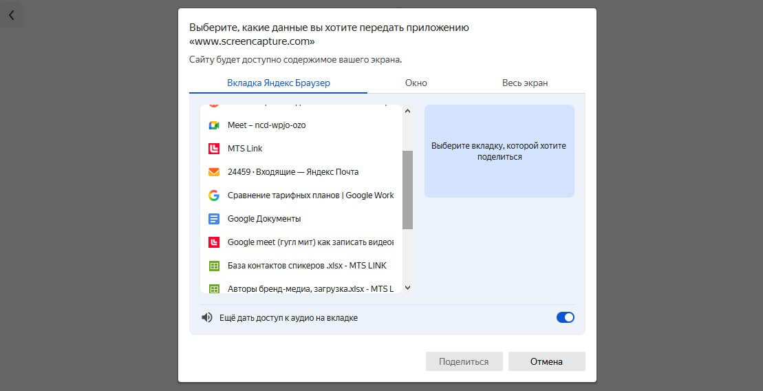 Начните запись и в открывшемся окне выберите область захвата (то, что вы хотите сохранить). В нашем случае это вкладка браузера с окном Google Meet. Нажмите «Поделиться», чтобы дать сайту доступ.