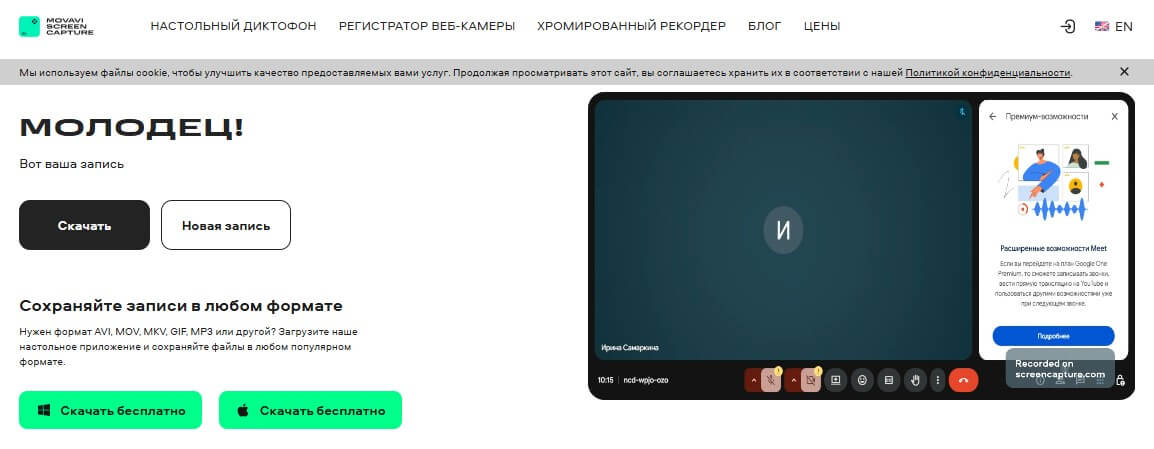 Если записать видео из онлайн-версии «Гугл Мит» не получается, используйте приложение для захвата экрана. Примеры таких программ: OBS Studio, Bandicam, Movavi Screen Recorder, Screen Recorder, iSpring Free Cam.