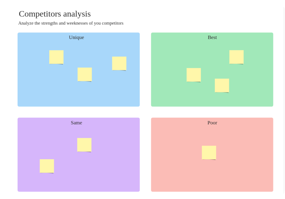 Создайте на онлайн-доске квадрат из четырех областей: сильные стороны, слабые стороны, возможности, угрозы. Работайте одновременно или по очереди, индивидуально и в командах. Техника помогает систематизировать мысли и оценить ситуацию с разных сторон.